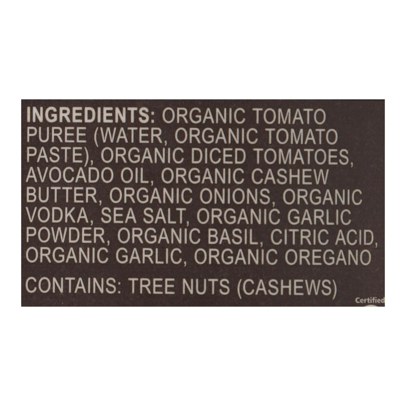 Organic tomato puree (water, organic tomato paste); organic diced tomatoes in organic tomato juice; avocado oil; pumpkin seed butter; organic onion; organic salted vodka; sea salt; citric acid; organic garlic powder; organic dried basil; organic garlic; organic dried oregano
