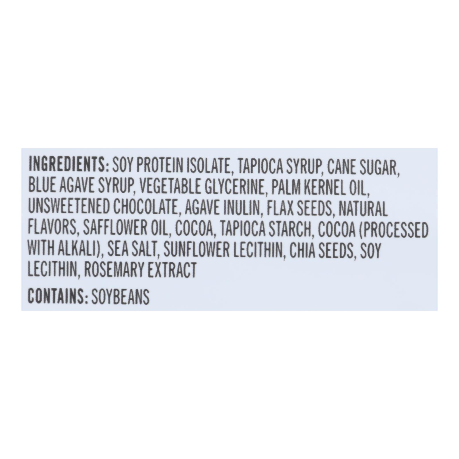Soy protein isolate, organic tapioca syrup, organic agave syrup, organic dried cane syrup, fractionated palm kernel oil, glycerine, organic agave inulin, unsweetened chocolate, omega blend (flaxseed, chia seed), natural flavor, high oleic safflower oil, cocoa, organic soy protein isolate (processed with alkali), tapioca starch, salt, soy lecithin, rosemary extract.