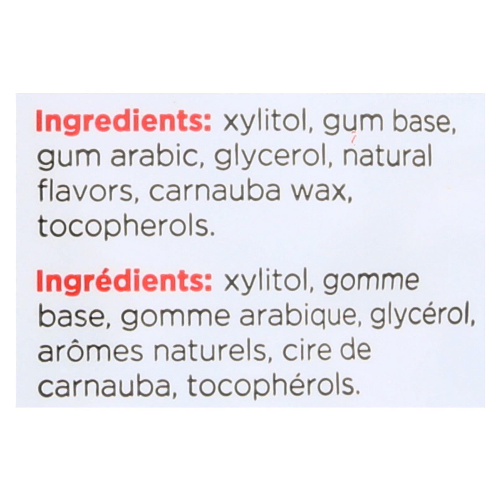 Xylitol, gum base, gum arabic, glycerol, natural flavors, carnauba wax, tocopherols.
