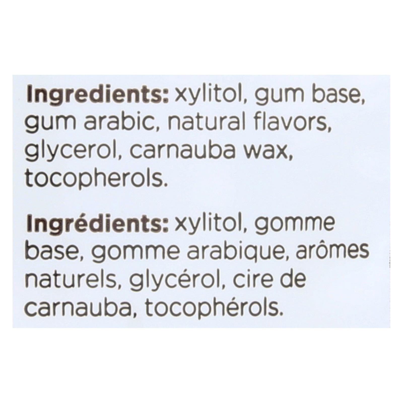 Xylitol, gum base, gum arabic, natural flavors, glycerol, carnauba wax, tocopherols.