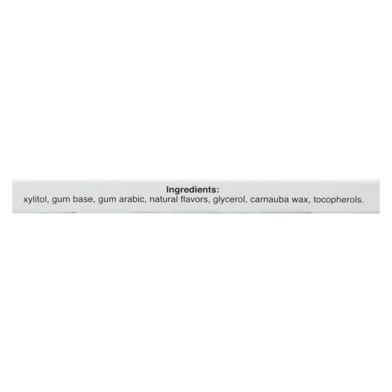 Xylitol, gum base, gum arabic, natural flavors, glycerol, carnauba wax, tocopherols.