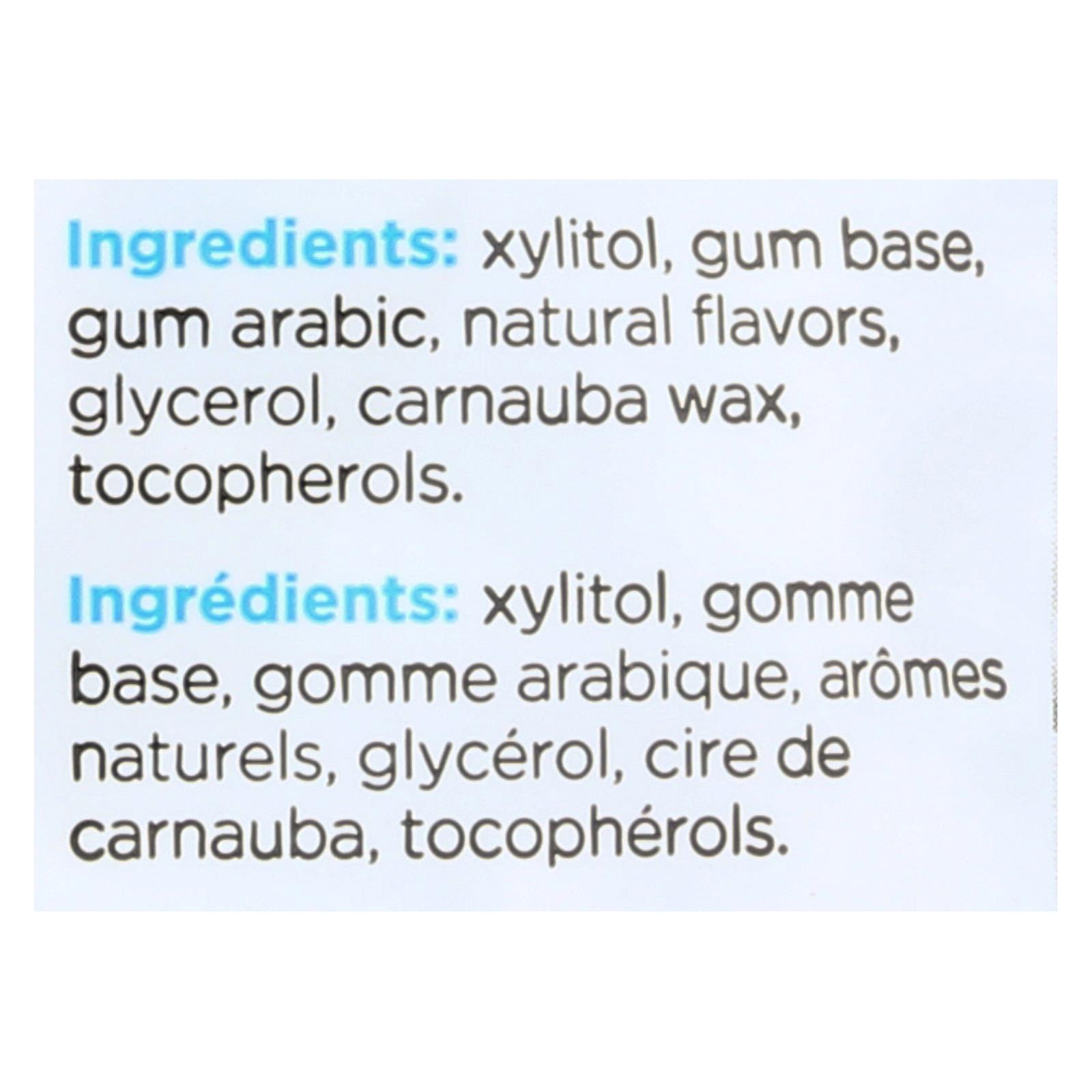 Xylitol, gum base, gum arabic, natural flavors, glycerol, carnauba wax, tocopherols.