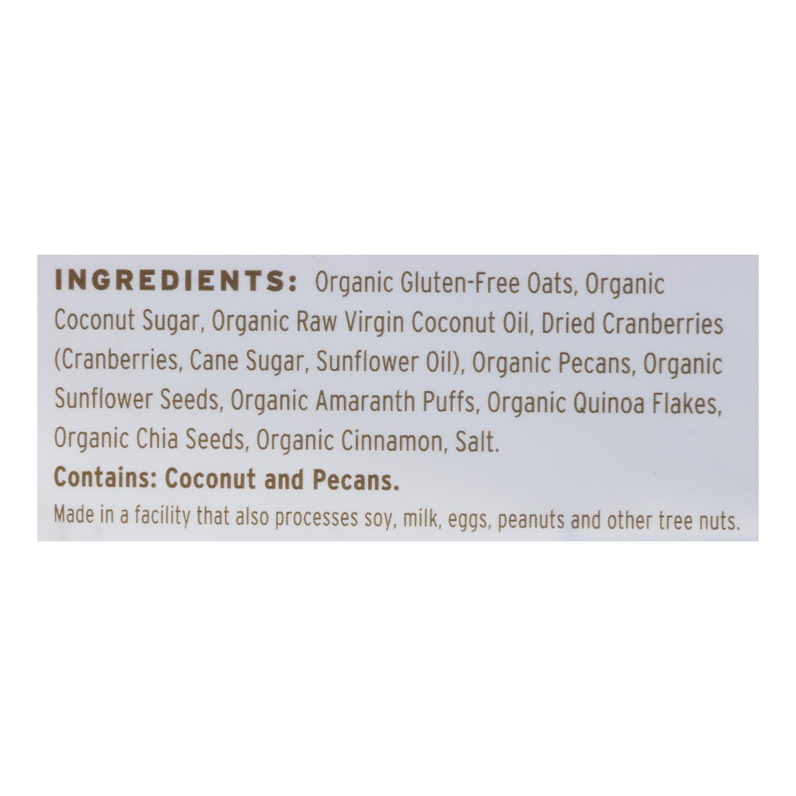 Organic certified gluten-free oats, organic coconut sugar, organic coconut oil, dried cranberries (cranberries, cane sugar, sunflower oil), organic pecans, organic sunflower seeds, organic amaranth puffs, organic quinoa flakes, organic chia seeds, organic cinnamon, sea salt.