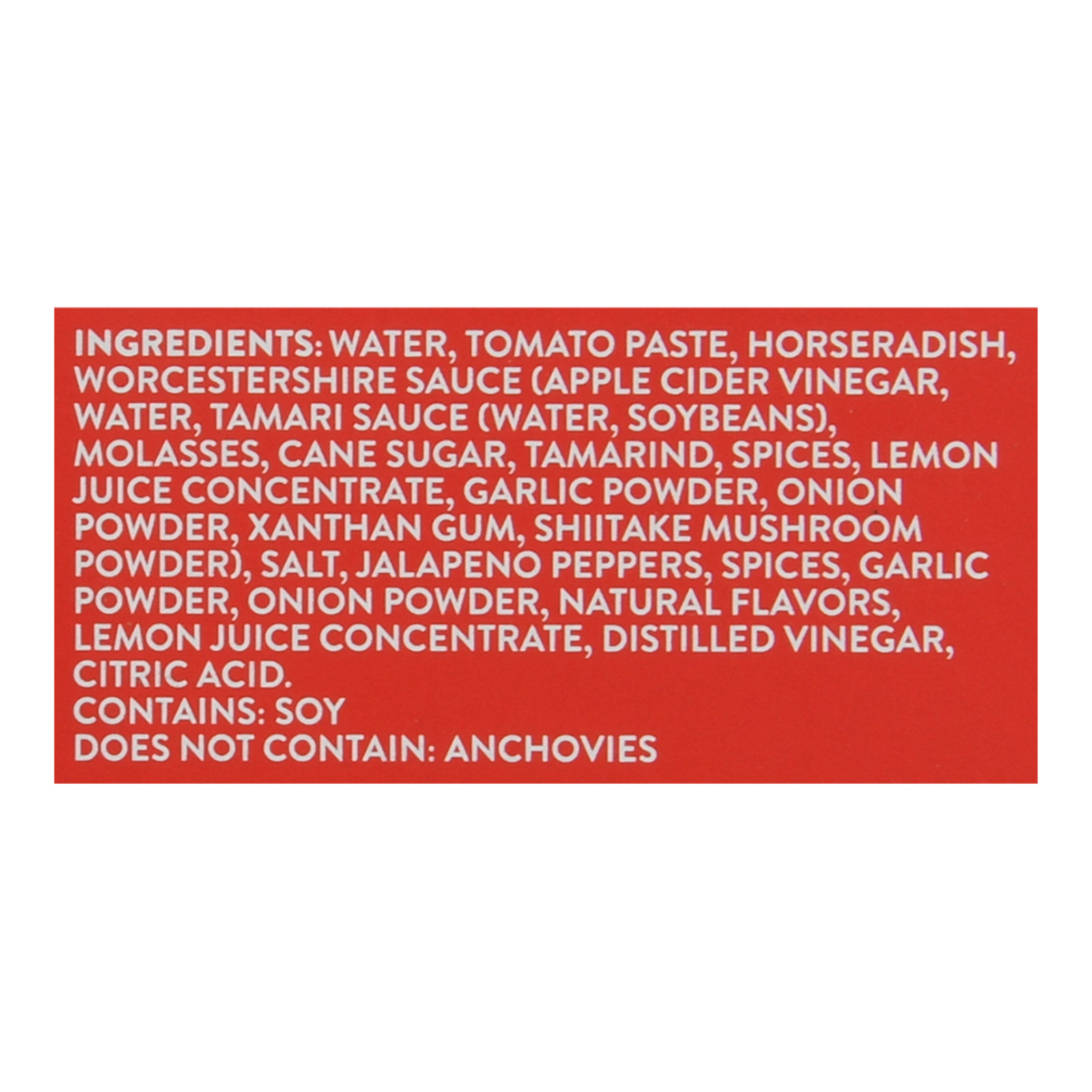 Water, tomato paste, horseradish, Worcestershire sauce (apple cider vinegar, water, tamari sauce (water, soybeans), molasses, cane sugar, tamarind, spices, lemon juice concentrate, garlic powder, onion powder, xanthan gum, shiitake mushroom powder), salt, jalapeno peppers, spices, garlic powder, onion powder, natural flavors, lemon juice concentrate, distilled vinegar, citric acid.