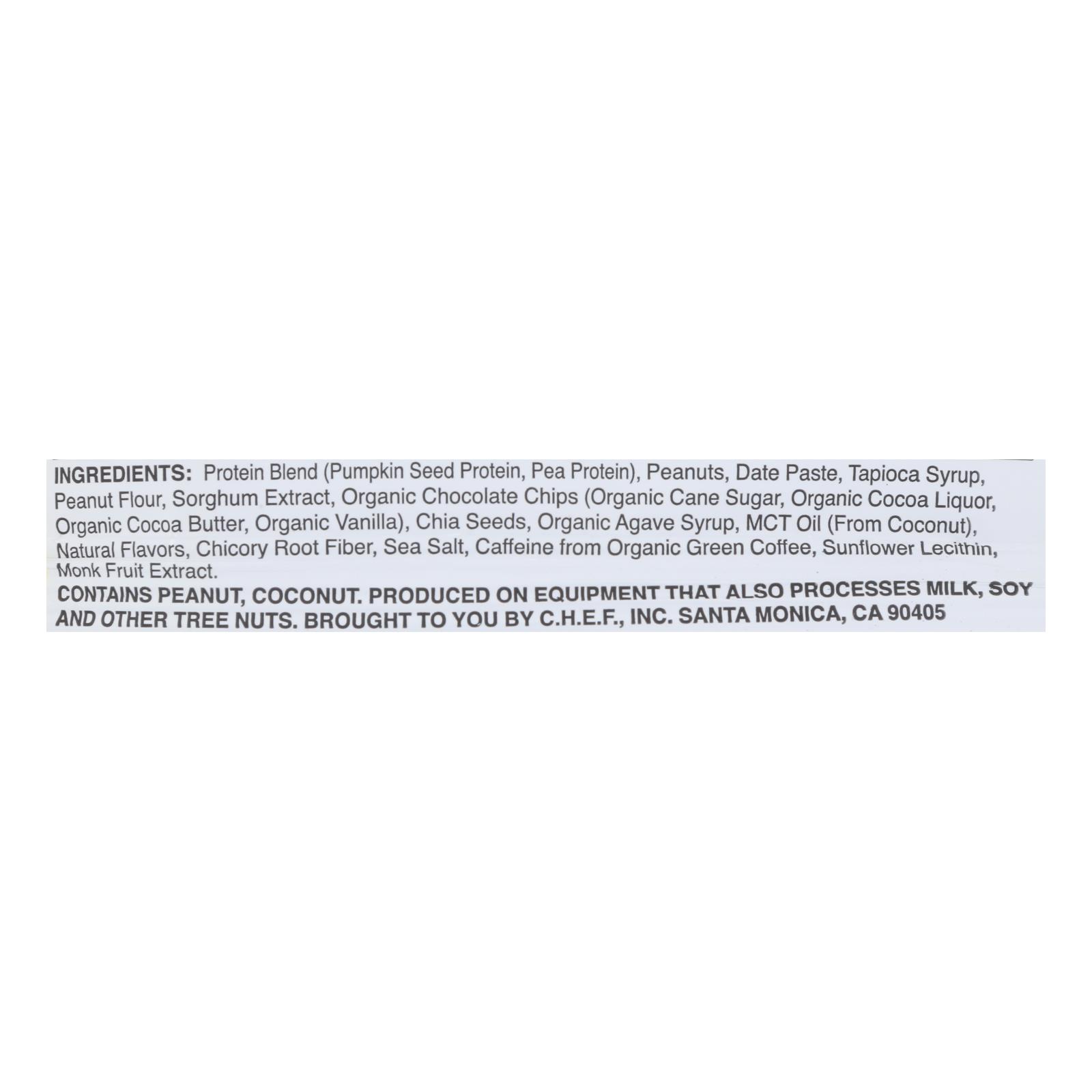 Protein blend (pumpkin seed protein, pea protein), peanuts, date paste, tapioca syrup, peanut flour, sorghum extract, organic chocolate chips (organic cane sugar, organic cocoa liquor, organic cocoa butter, organic vanilla), chia seeds, organic agave syrup, MCT oil (from coconut), natural flavors, chicory root fiber, sea salt, caffeine from organic green coffee, sunflower lecithin, monk fruit extract.