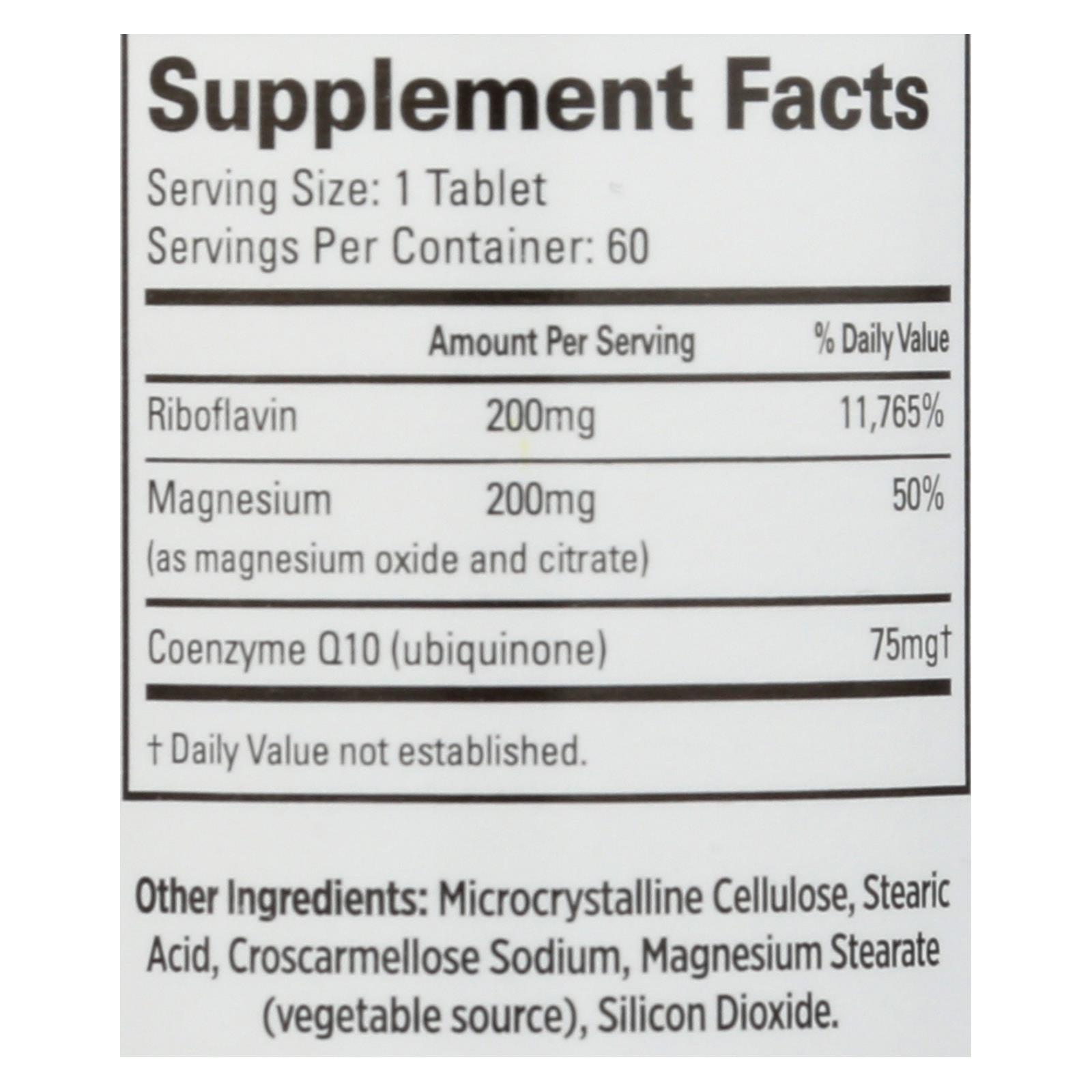Quantum health migshield is made with ingredients like riboflavin, magnesium and coenzyme q10. Each 60 tablet bottle has 60 servings of 1 tablet each. Our dietary supplement does not contain artificial flavors, preservatives or yeast. See label for warnings and risks. See nutrition panel for allergens.