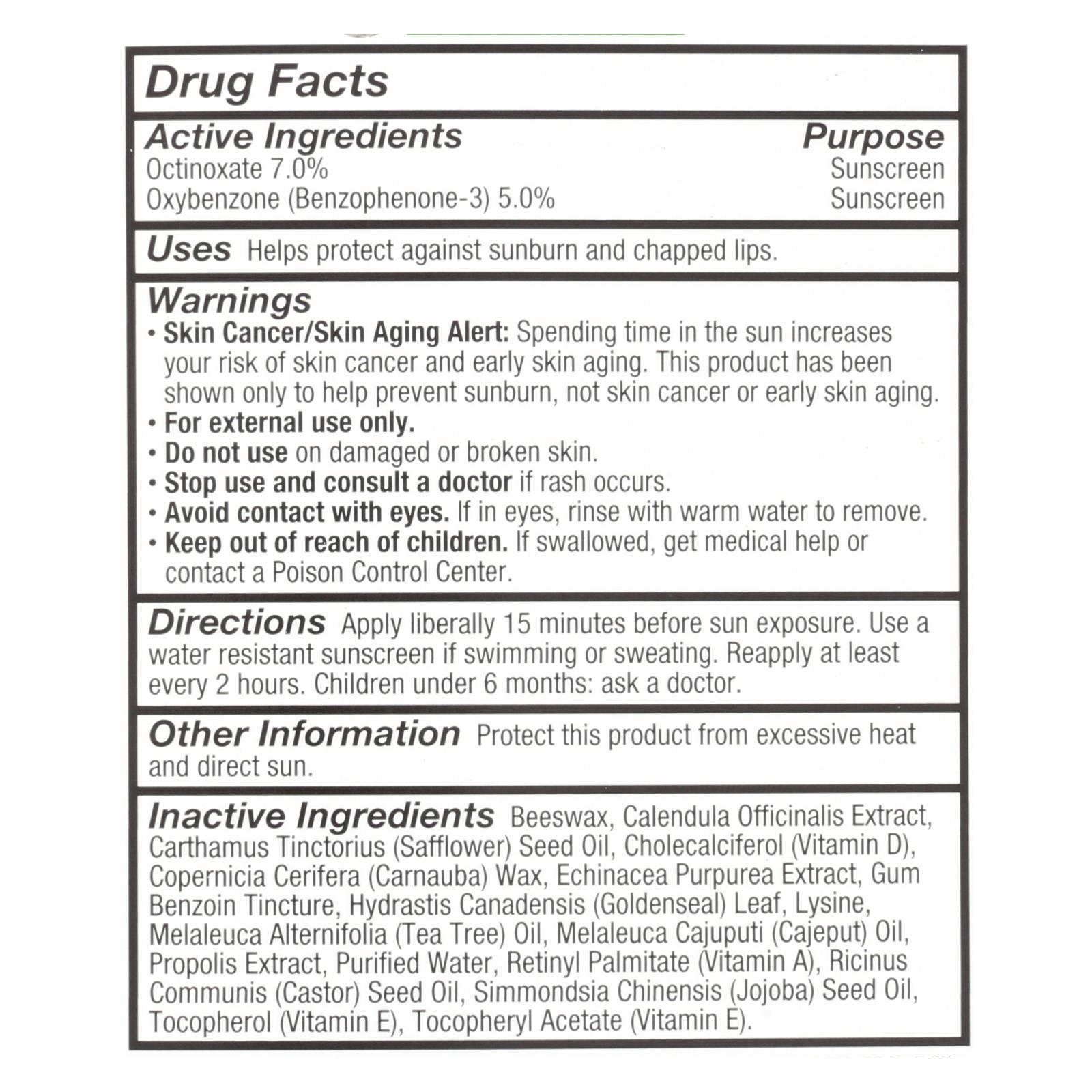 Active: Octinoxate 7.0% (purpose: sunscreen), Oxybenzone (Benzophenone-3) 5.0% (purpose: sunscreen). Inactive: Beeswax, Calendula officinalis extract, Carthamus tinctorius (safflower) seed oil, Cholecalciferol (vitamin D), Copernicia cerifera (carnauba) wax, Echinacea purpurea extract, Gum benzoin tincture, Hydrastis canadensis (goldenseal) leaf, Lysine, Melaleuca alternifolia (tea tree) oil, Melaleuca cajuputi (cajeput), Propolis extract, Purified water, Retinyl palmitate (vitamin A), Ricinus communis (castor), Simmondsia chinensis (jojoba).