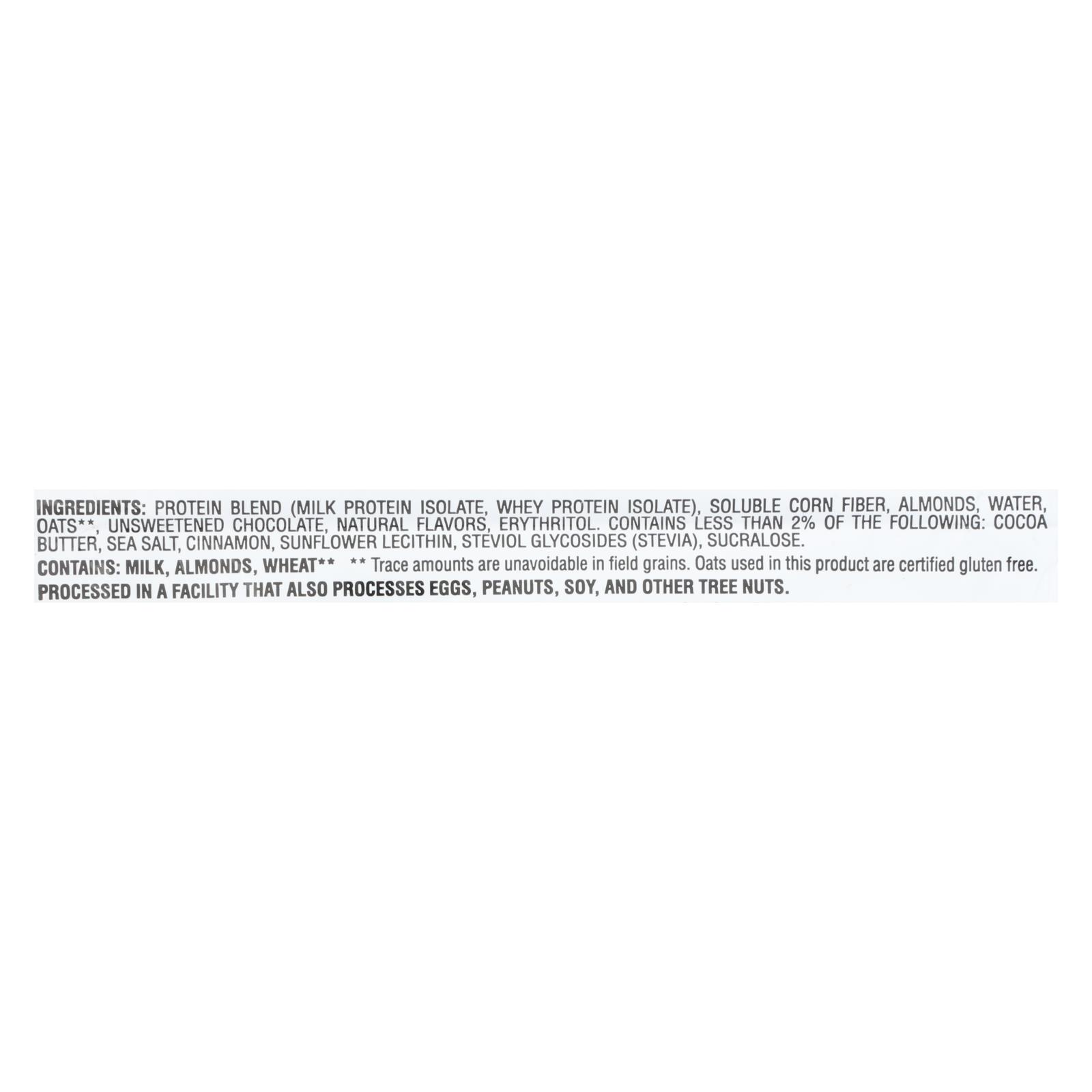 Protein blend (milk protein isolate, whey protein isolate), soluble corn fiber, almonds, water, oats, unsweetened chocolate, natural flavors, erythritol. Contains less than 2% of the following: cocoa butter, sea salt, cinnamon, sunflower lecithin, stevia sweetener, sucralose.