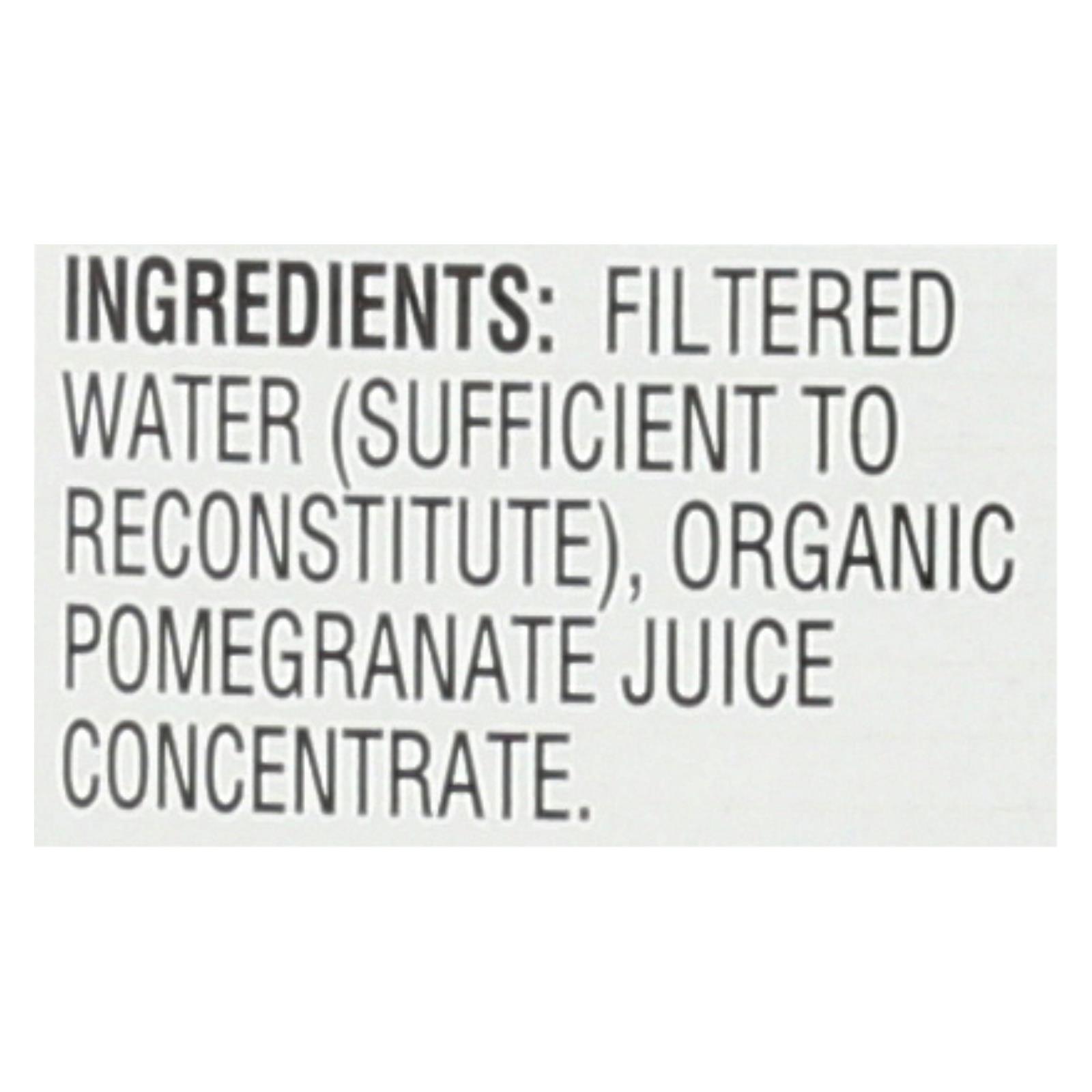 Filtered water (sufficient to reconstitute), organic pomegranate juice concentrate.