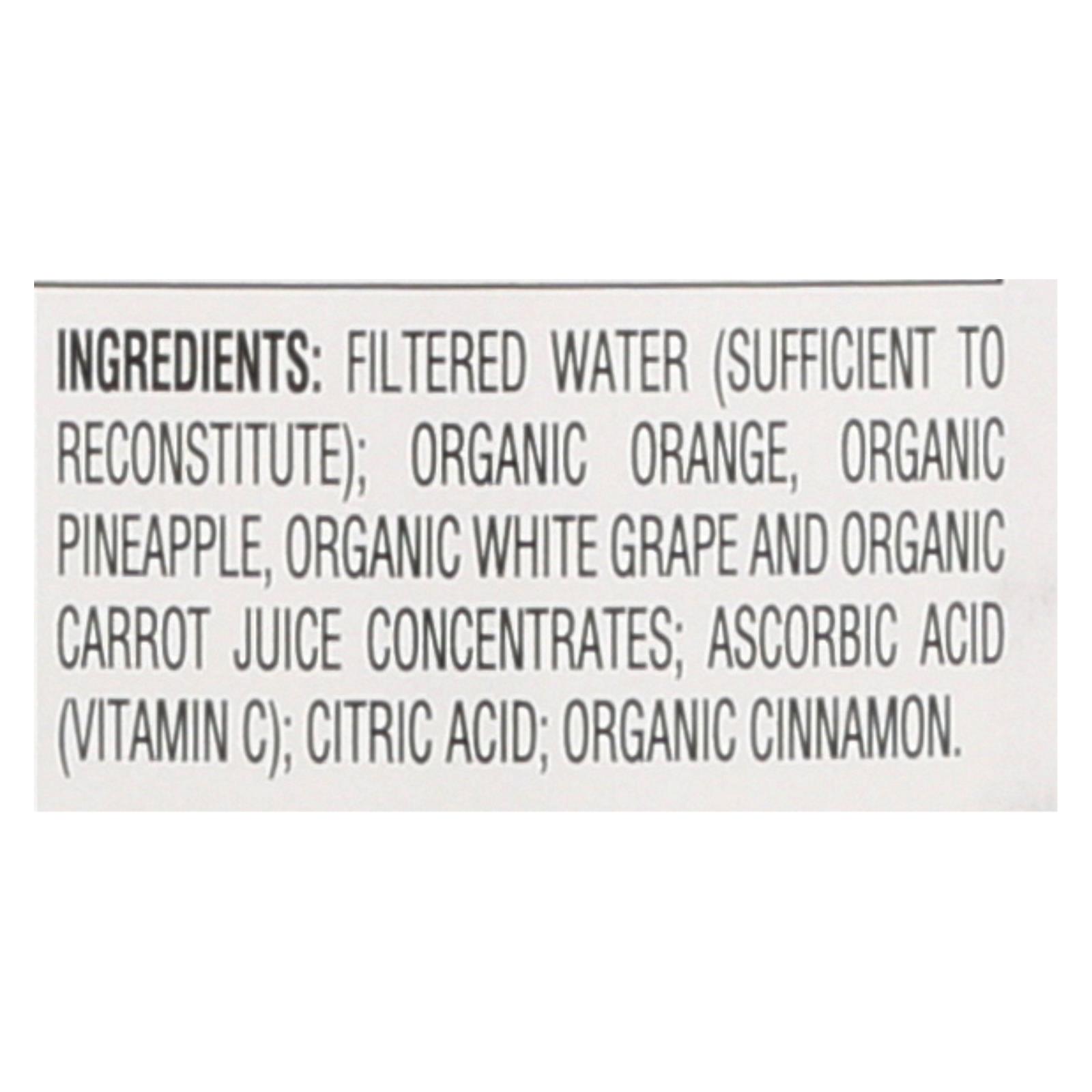 ingredients : filtered water (sufficient to reconstitute);organic orange;organic pineapple;organic white grape and organic carrot juice concentrates;ascorbic acid (vitamin c);brewed organic cinnamon