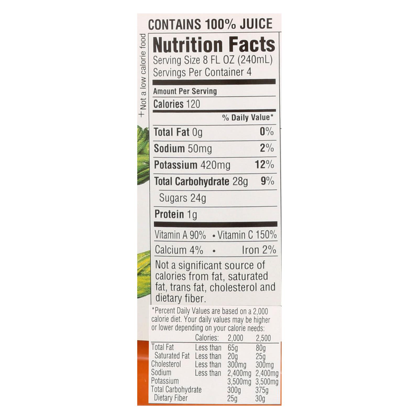 Rw knudsen’s organic carrot orange juice is all-natural, so there are no preservatives, artificial colors or added sugar. Every 32 fl. Oz. Bottle is certified organic and non-gmo and pastuerized for your safety. Each cup of juice is equivalent to one serving of fruit. See nutrition facts panel for allergens.