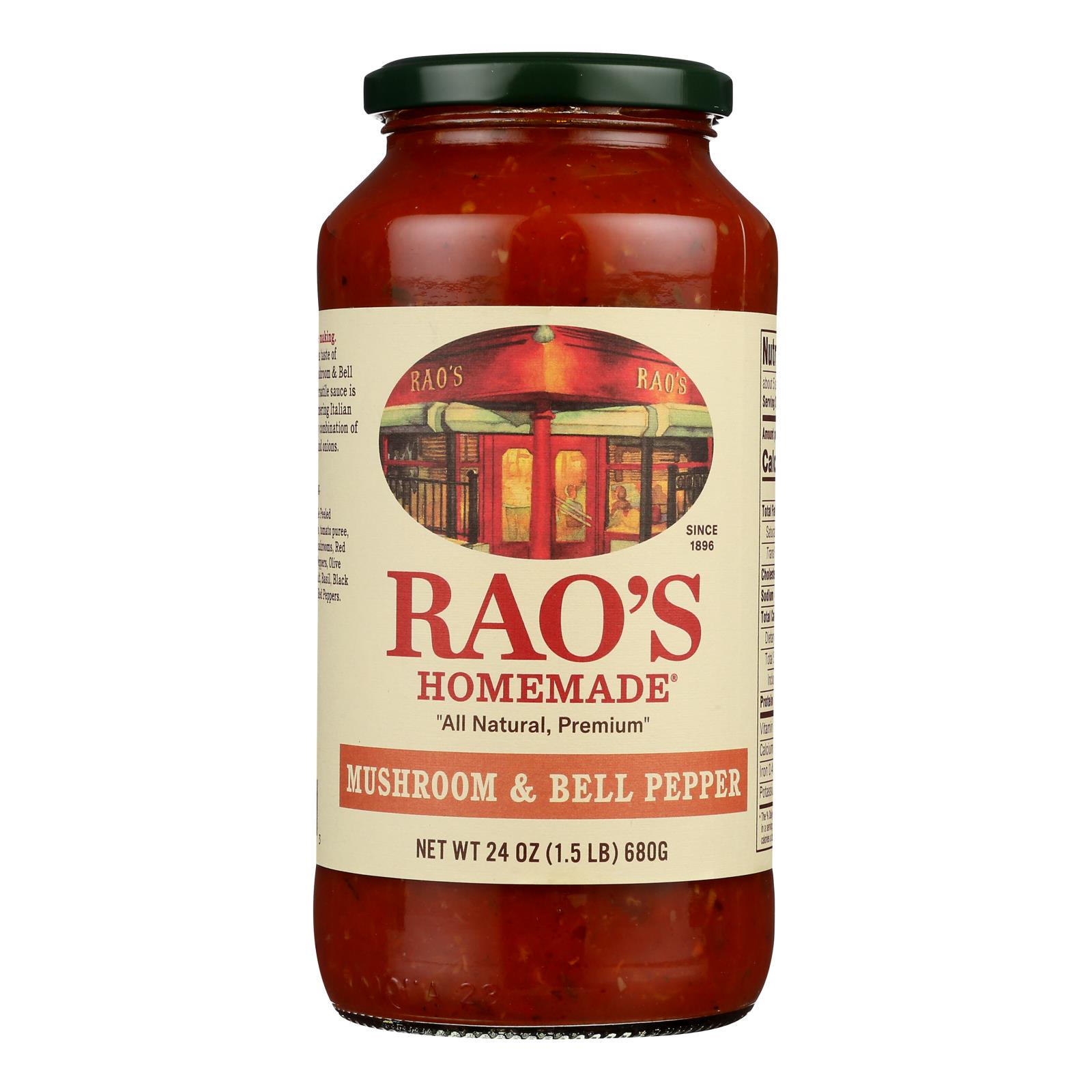 Rao’s Specialty Food Homemade Sauce Peppers and Mushroom is a kosher, GMO-free Italian-style sauce in a 24 oz jar, sold in a convenient case of 12