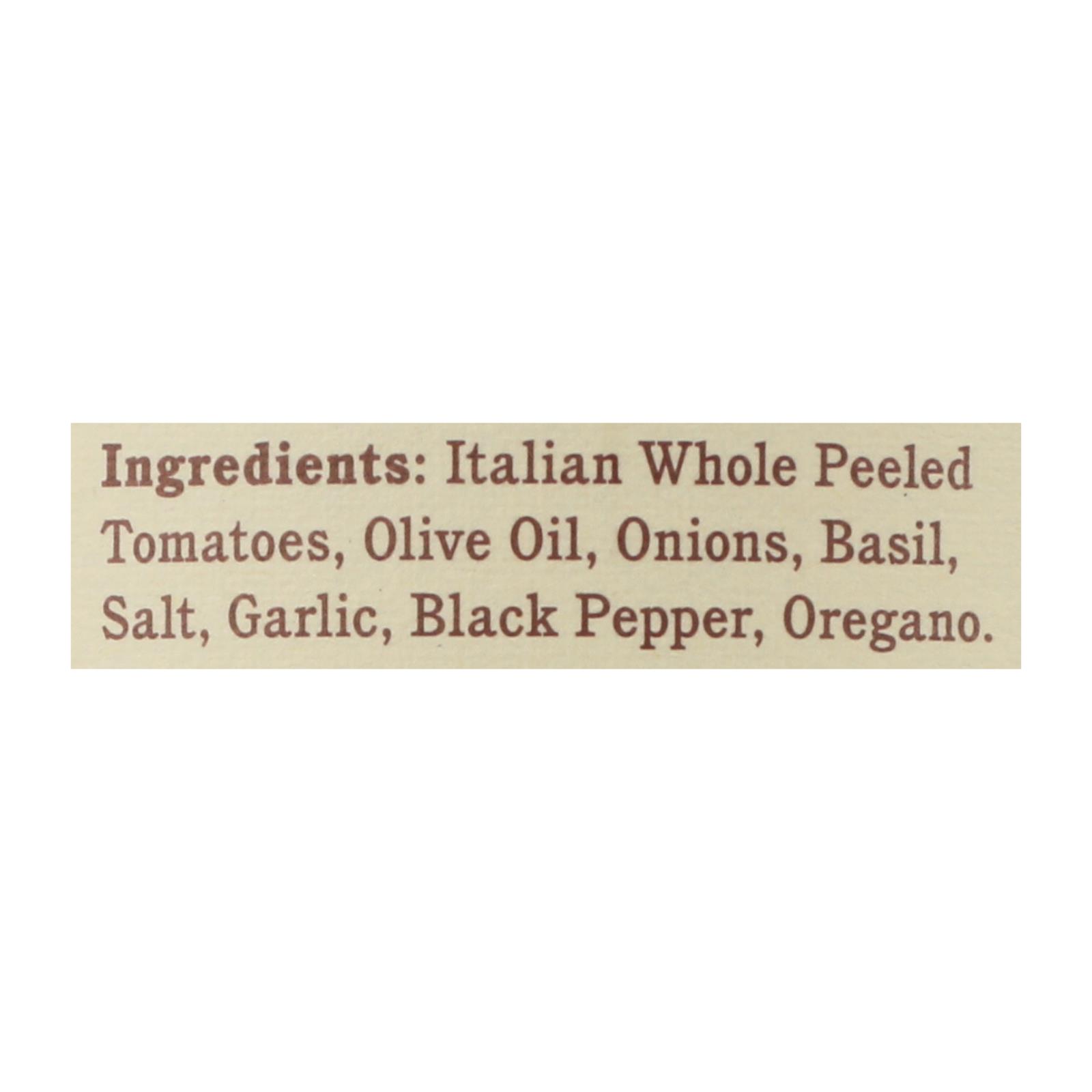 Italian whole peeled tomatoes, olive oil, onions, basil, salt, garlic, black pepper, oregano.