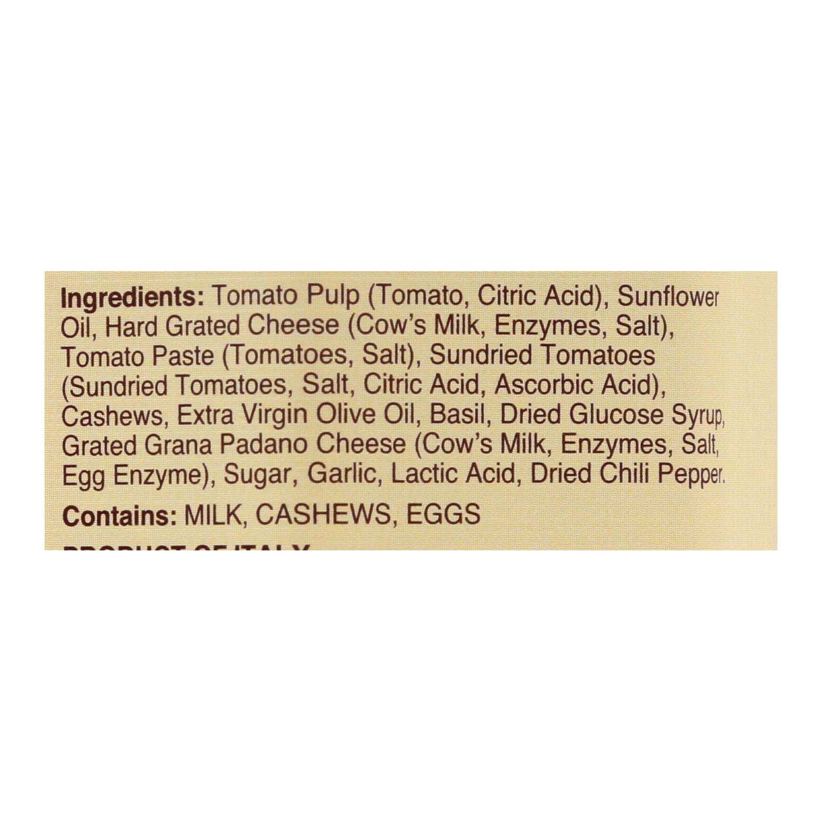 Tomato pulp (tomato, citric acid); sunflower oil; hard grated cheese (cow’s milk, enzymes, salt); tomato paste (tomatoes, salt); sundried tomatoes (sundried tomatoes, salt, citric acid, ascorbic acid); cashews; extra virgin olive oil; basil; dried glucose syrup; grated grana padano cheese (cow’s milk, enzymes, salt, egg enzyme); sugar; garlic; lactic acid; dried chili pepper.