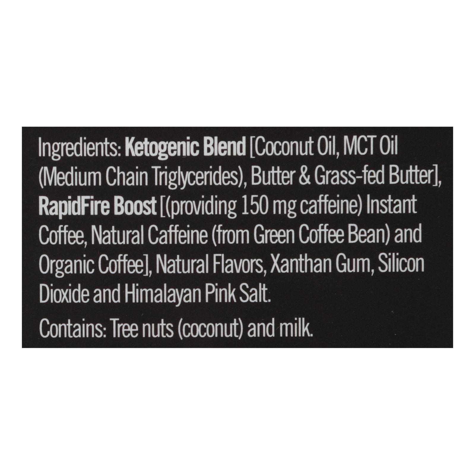 Ketogenic blend [coconut oil, MCT oil (medium chain triglycerides), butter & grass-fed butter]; Rapidfire boost [(providing 150 mg caffeine) instant coffee, natural caffeine (from green coffee bean) and organic coffee]; natural flavors; xanthan gum; silicon dioxide; Himalayan pink salt.