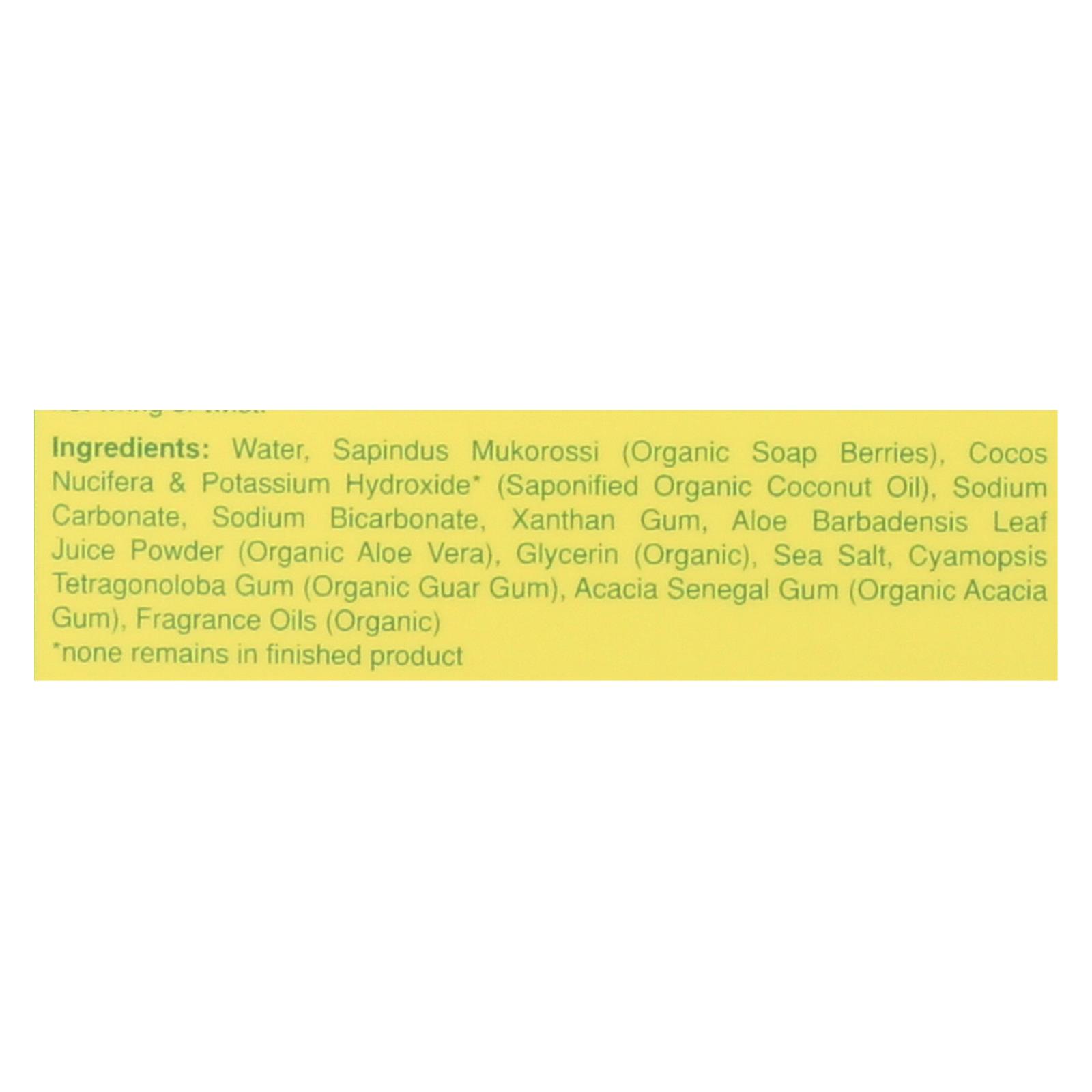 Water, Sapindus mukorossi (organic soap berries), Cocos nucifera & potassium hydroxide (saponified organic coconut oil), sodium carbonate, sodium bicarbonate, xanthan gum, aloe barbadensis leaf juice powder (organic aloe vera), glycerin (organic), sea salt, cyamopsis tetragonoloba gum (organic guar gum), acacia senegal gum (organic acacia gum), fragrance oils.