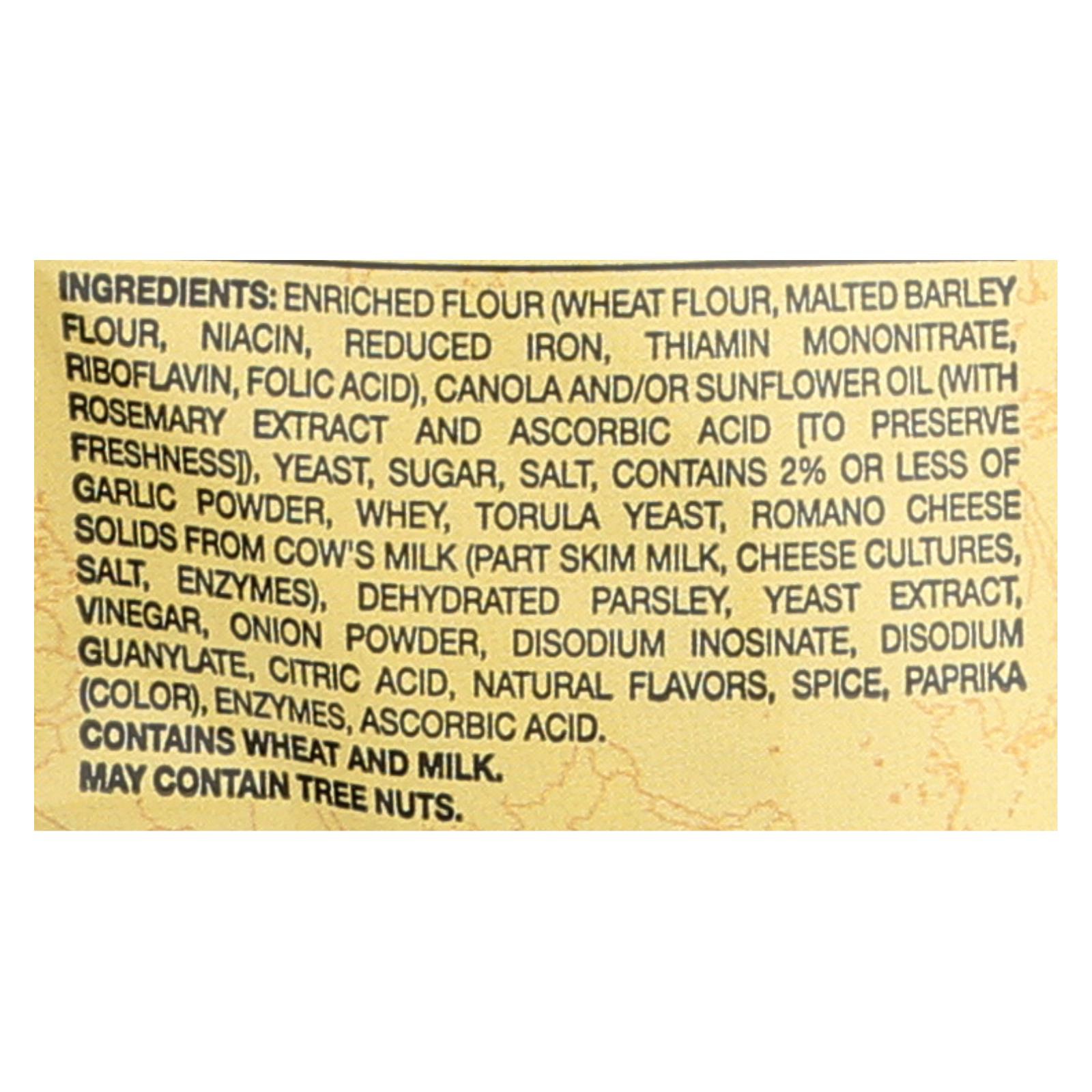 ingredients : enriched flour;wheat flour;malted barley flour;niacin;reduced iron;thiamin mononitrate;riboflavin;folic acid;canola and/or sunflower oil;with rosemary extract and ascorbic acid [to preserve freshness];yeast;sugar;salt;contains 2% or less of garlic powder;whey;torula yeast;romano cheese solids from cow’s milk;park skim milk;cheese cultures;enzymes;dehydrated parsley;yeast extract;vinegar;onion powder;disodium inosinate;disodium guanylate;citric acid;natural flavors;spice;paprika;color;ascorbic ac