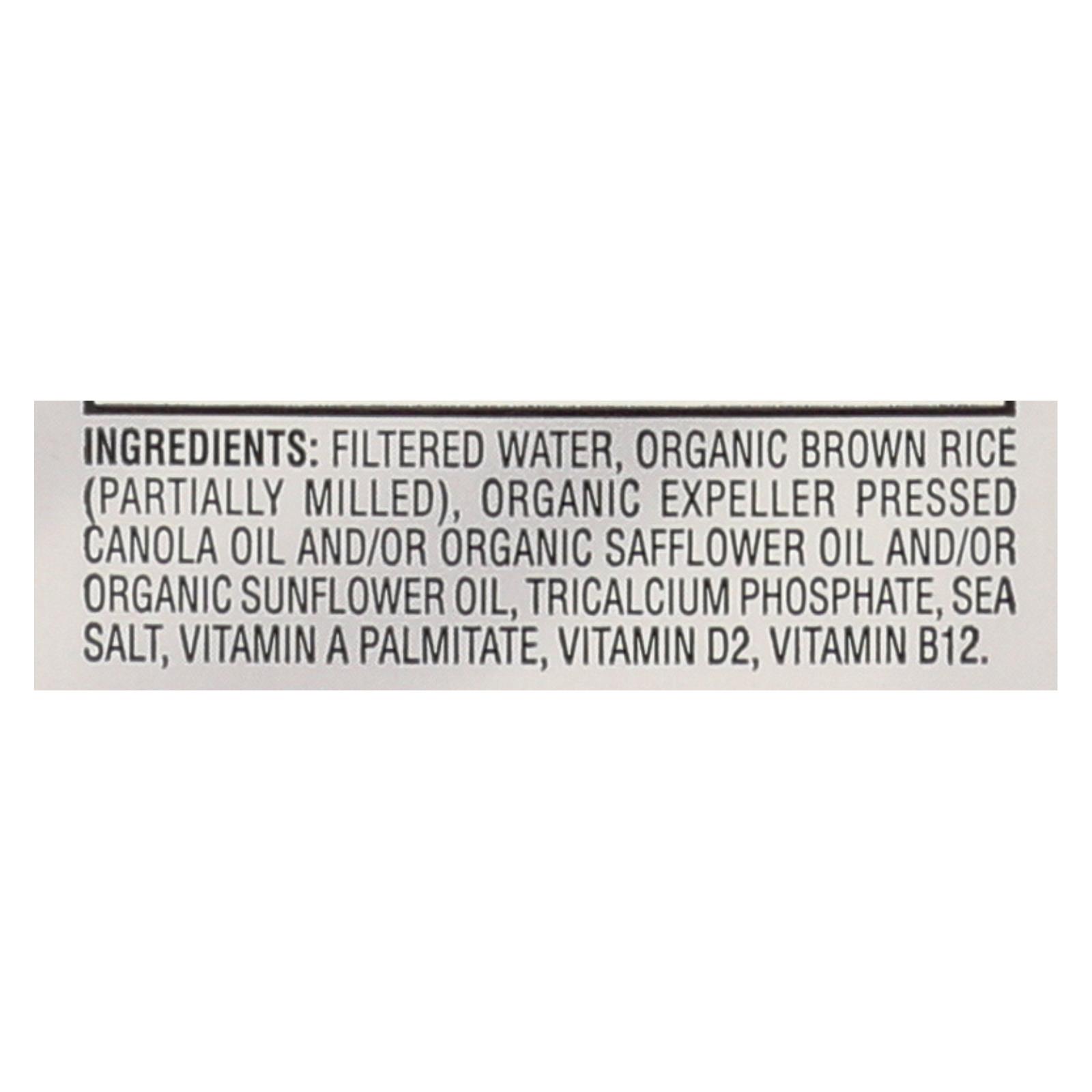 Filtered water, organic brown rice (partially milled), organic expeller pressed canola oil and/or organic safflower oil and/or organic sunflower oil, tricalcium phosphate, sea salt, vitamin A palmitate, vitamin D2, vitamin B12.