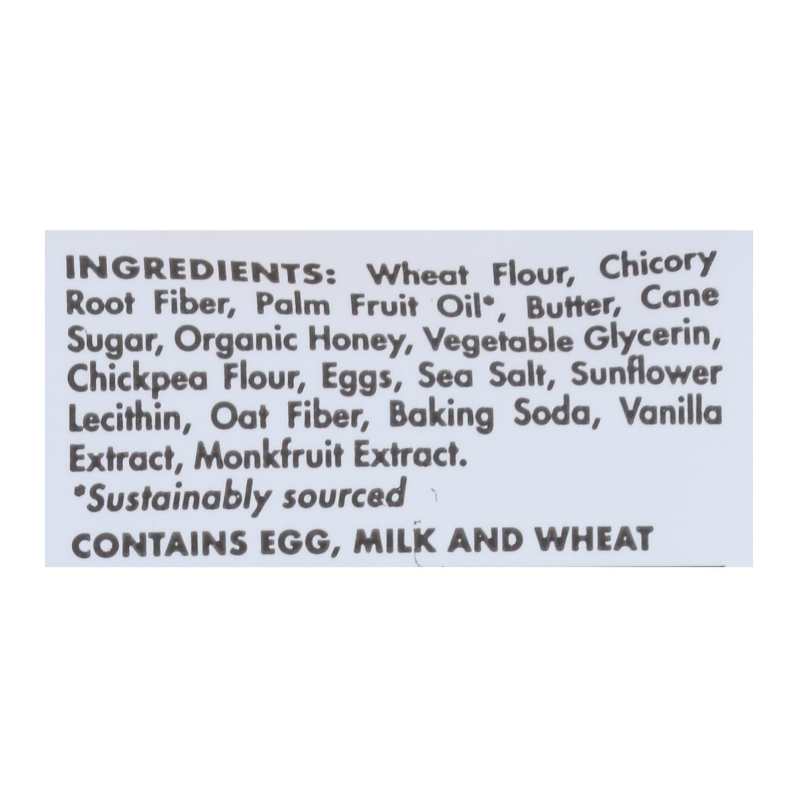 Wheat flour, chicory root fiber, palm fruit oil, butter, cane sugar, organic honey, vegetable glycerin, chickpea flour, eggs, sea salt, sunflower lecithin, oat fiber, baking soda, vanilla extract, monkfruit extract.