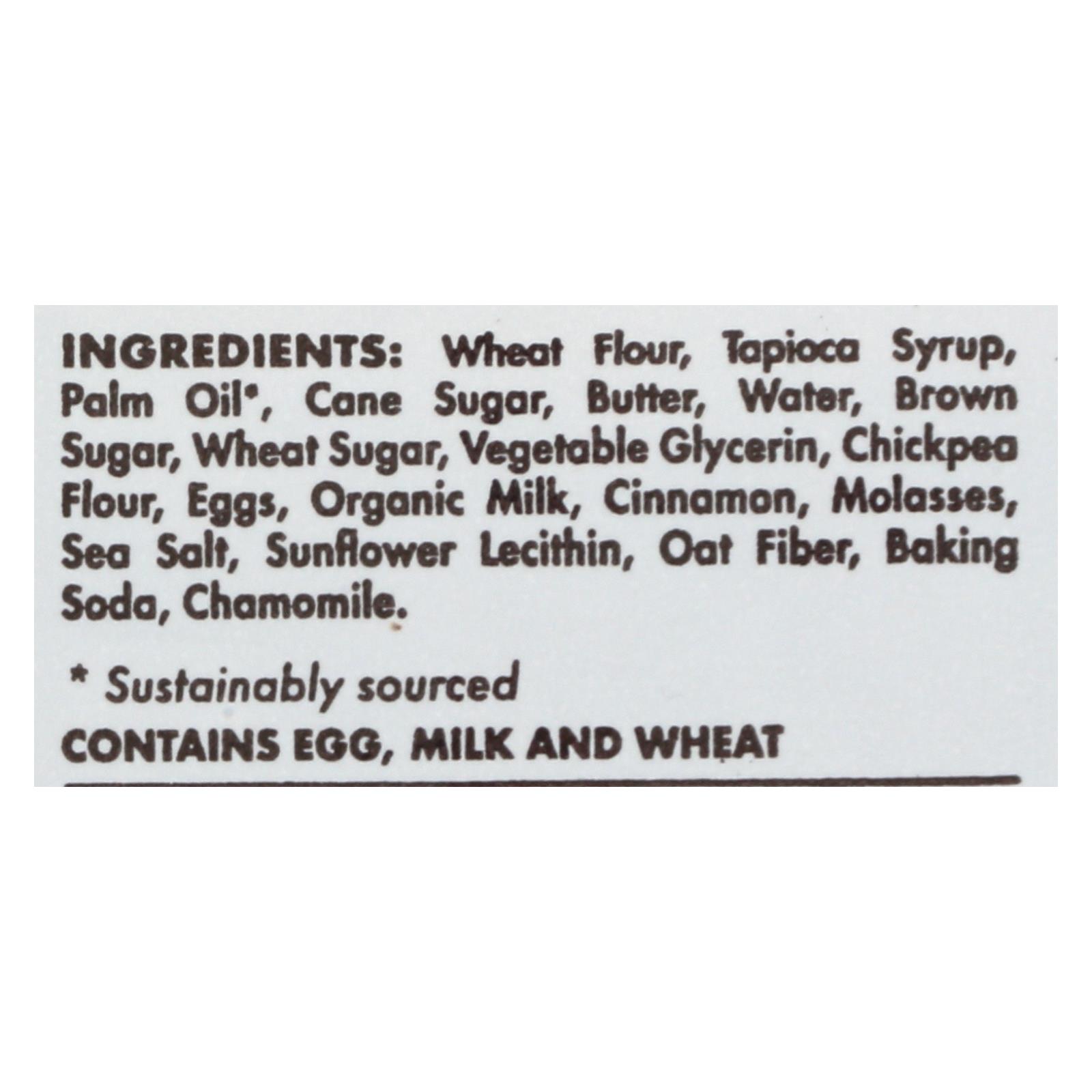 wheat flour, tapioca syrup, palm oil, cane sugar, butter, water, brown sugar, wheat sugar, vegetable glycerin, chickpea flour, eggs, organic milk, cinnamon, molasses, sea salt, sunflower lecithin, oat fiber, baking soda, chamomile