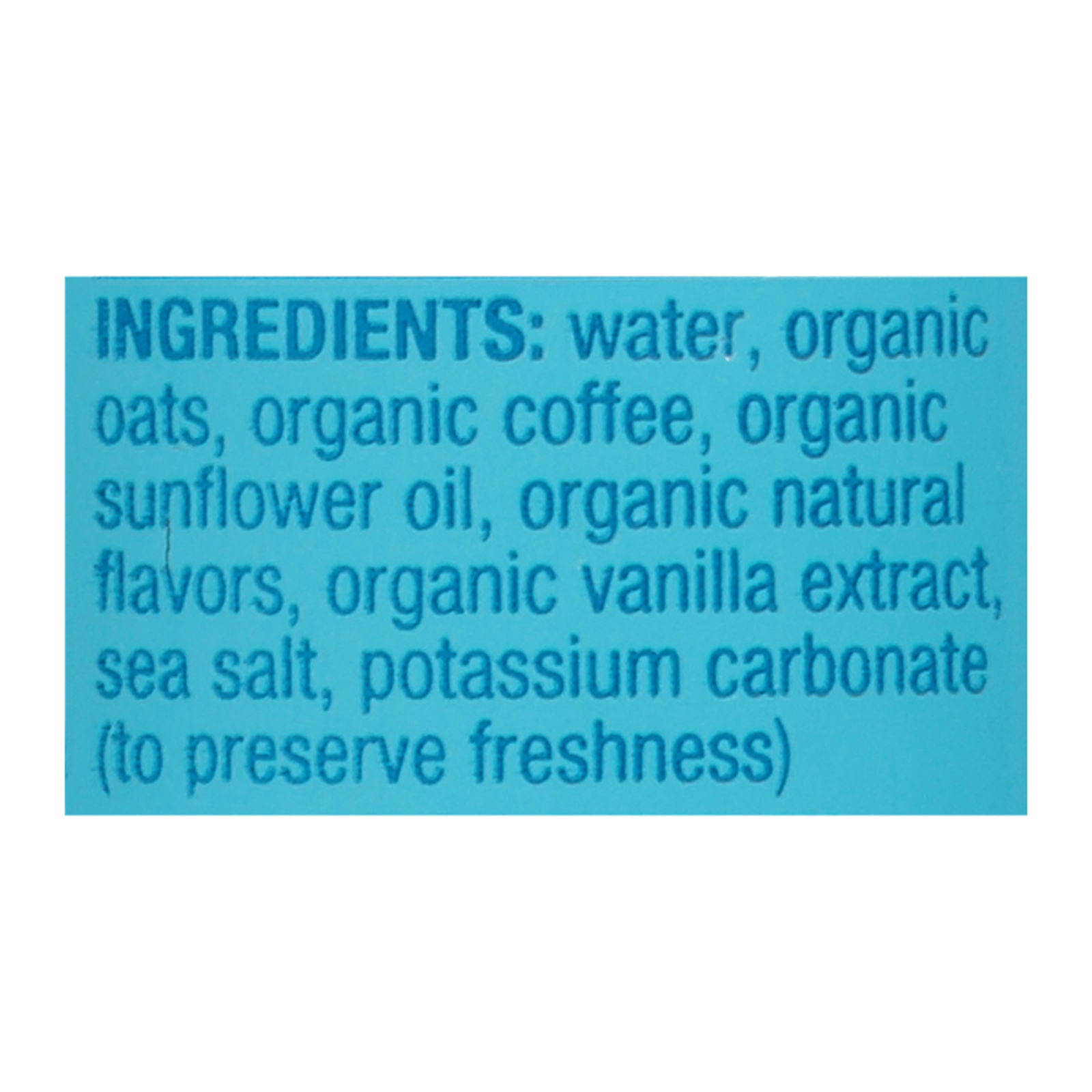 ingredients : water;organic oats;organic coffee;organic sunflower oil;organic natural flavors;organic vanilla extract;sea salt;potassium carbonate (to preserve freshness)