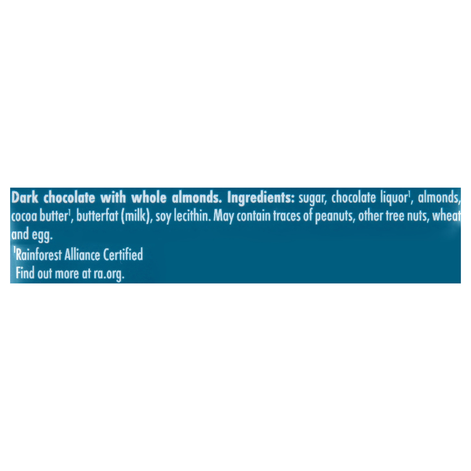 Whole almonds, dark chocolate (Rainforest Alliance Certified cocoa).