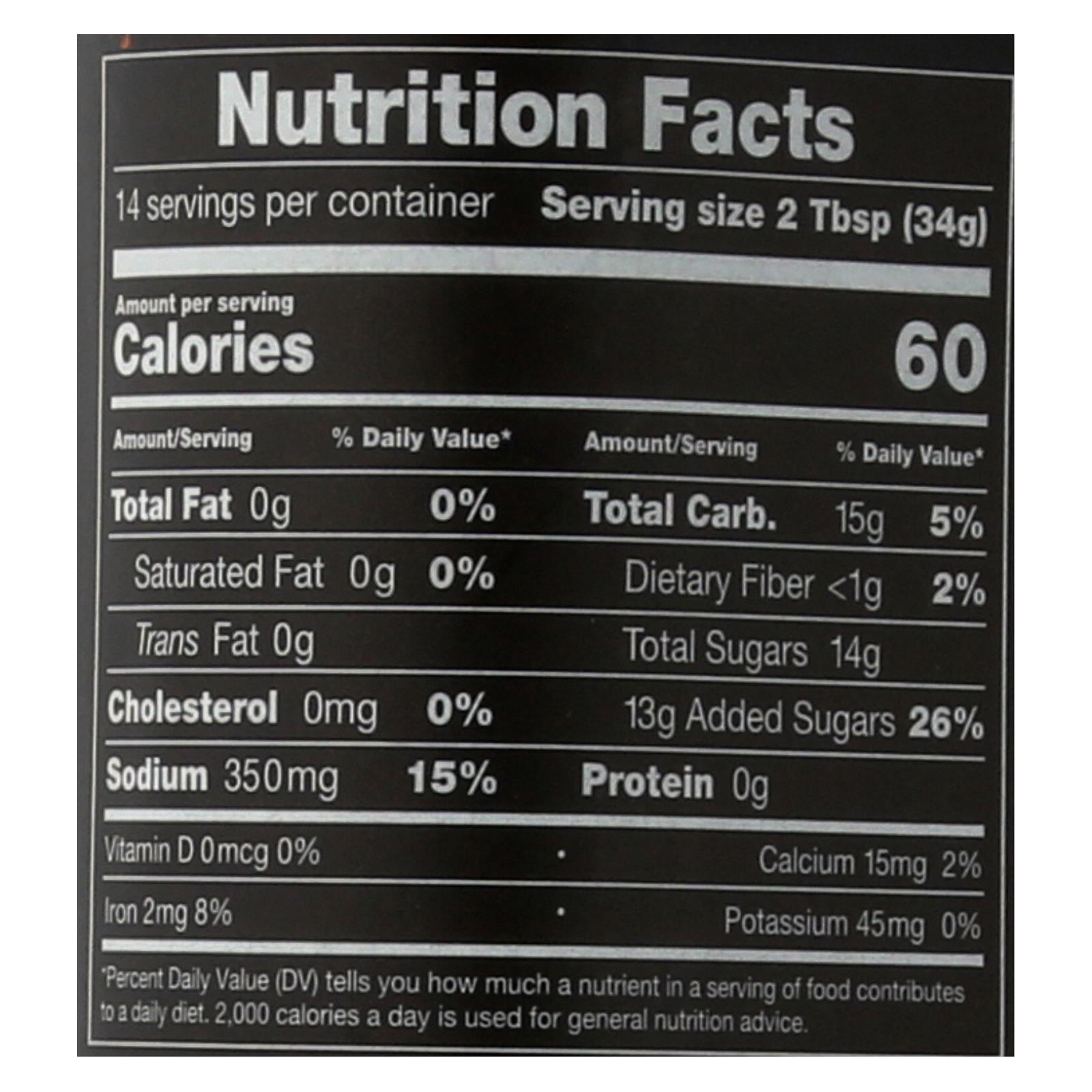 Tomato puree (tomato paste, water), sugar, brown sugar, water, molasses, distilled vinegar, salt, raisin paste, orange juice (from concentrate), tamed soy sauce (water, soybeans, salt, sugar), dried onion, chipotle pepper, natural flavor, smoke flavor, spices (including mustard flour), garlic powder, celery seed.