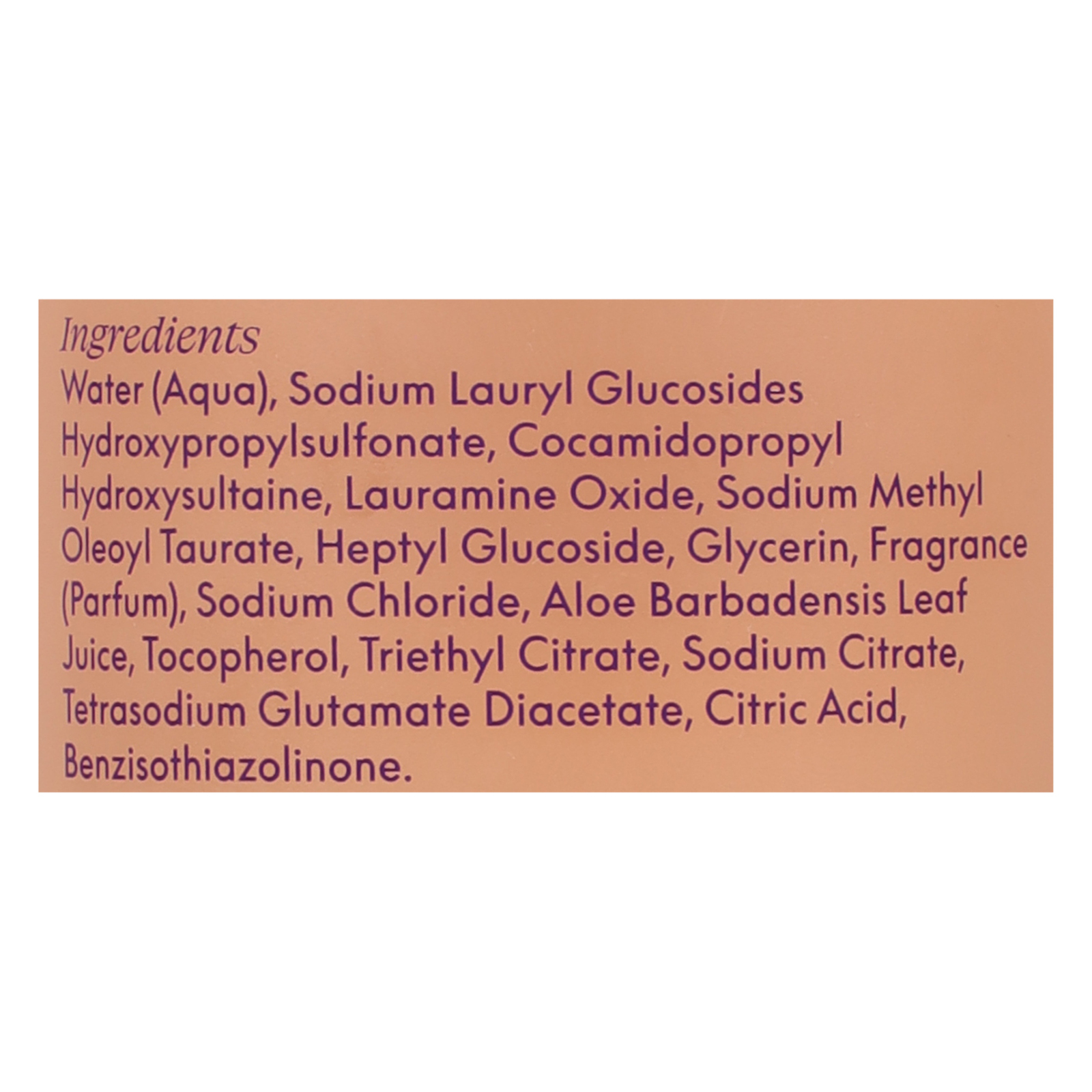 ingredients : water (aqua);sodium lauryl glucosides hydroxypropylsulfonate;cocamidopropyl hydroxysultaine;lauramine oxide;sodium methyl oleoyl taurate;heptyl glucoside;glycerin;fragrance (parfum);sodium chloride;aloe barbadensis leaf juice;tocopherol;triethyl citrate;sodium citrate;tetrasodium glutamate diacetate;citric acid;benzisothiazolinone