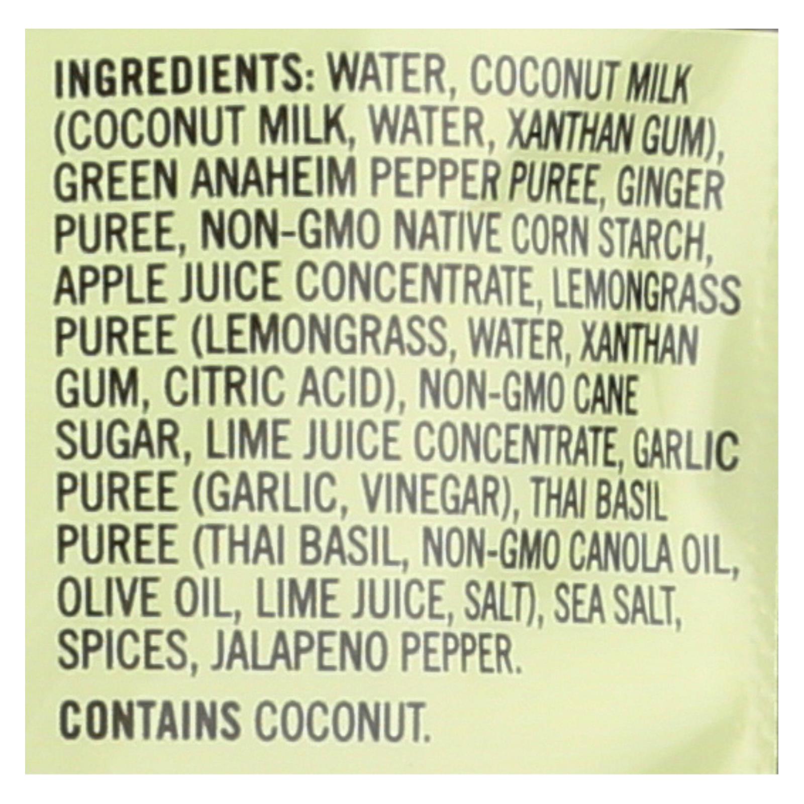 ingredients : water;coconut milk;xanthan gum;green anaheim pepper puree;ginger puree;non-gmo native corn starch;apple juice concentrate;lemongrass puree;lemon grass;citric acid;non-gmo cane sugar;lime juice concentrate;garlic puree;garlic vinegar;thai basil puree;thai basil;non-gmo canola oil;olive oil;lime juice;salt;sea salt;spices;jalapeno pepper
