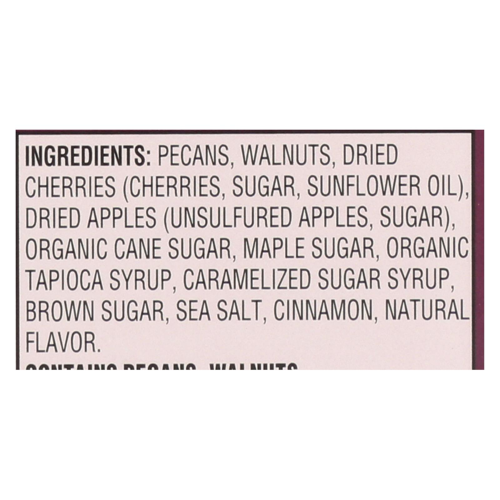 Pecans, walnuts, dried cherries, cherries, sugar, sunflower oil, dried apples, unsulfured apples, organic cane sugar, maple sugar, organic tapioca syrup, caramelized sugar syrup, brown sugar, sea salt, cinnamon, natural flavor.