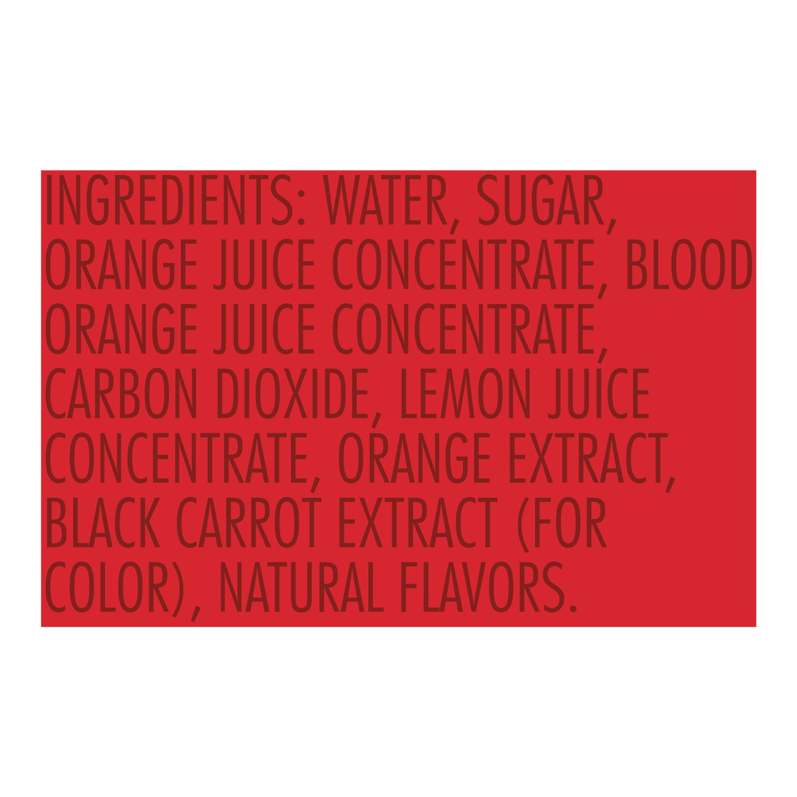 Water, sugar, orange juice concentrate, blood orange juice concentrate, carbon dioxide, lemon juice concentrate, orange extract, black carrot extract (for color), natural flavors.