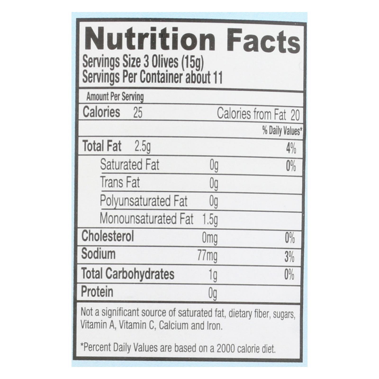 Enjoy large, pitted black olives from Santa Barbara, gluten-free and kosher, in a convenient 12-pack of 5.75 oz jars made in the USA