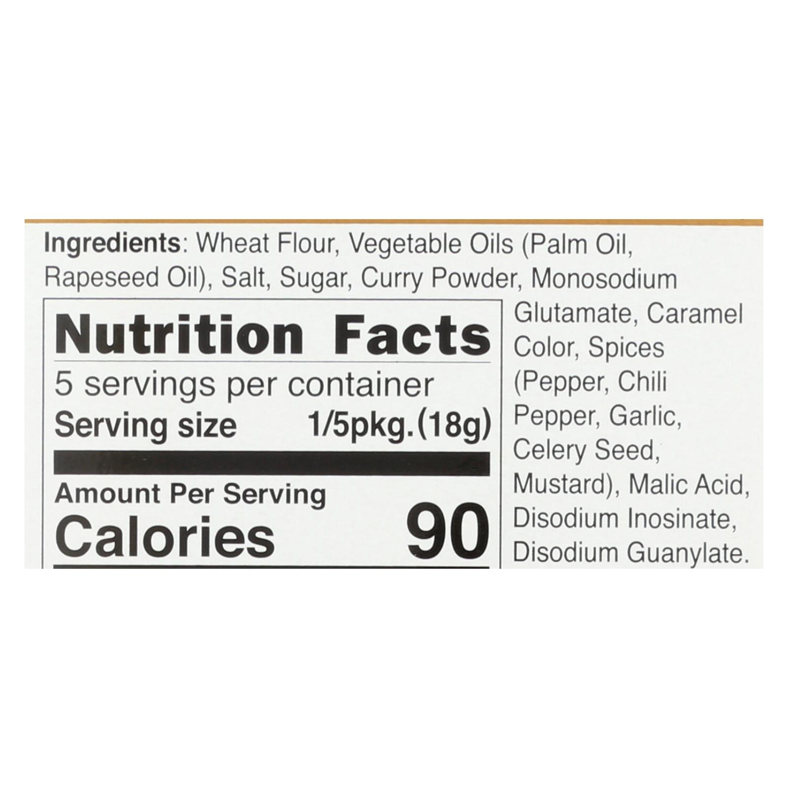 wheat flour, vegetable oils (palm oil, rapeseed oil), salt, sugar, curry powder, monosodium glutamate, caramel color, spices, pepper, chili pepper, garlic, celery seed, mustard, malic acid, disodium inosinate, disodium guanylate