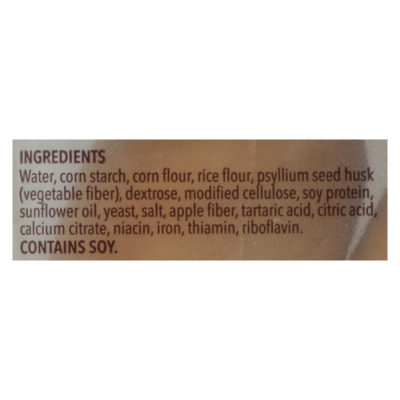 Corn starch, water, corn flour, rice flour, psyllium seed husk (vegetable fiber), dextrose, modified cellulose, soy protein, sunflower oil, yeast, salt, tartaric acid, citric acid.