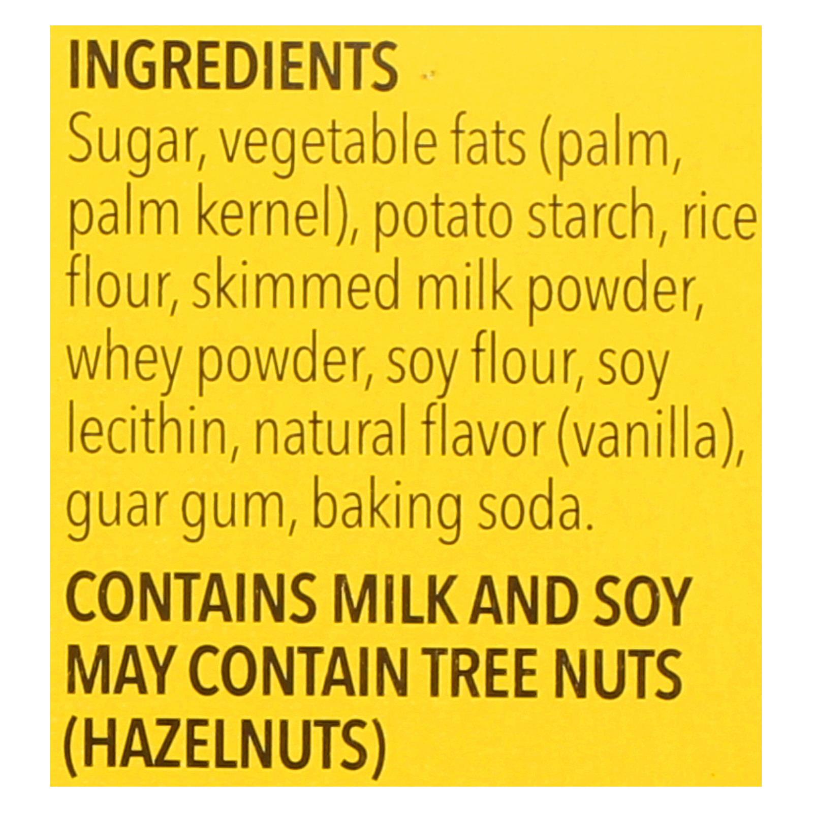 ingredients : potato starch;sugar;coconut oil;skimmed milk powder;rice flour;whey powder;soy flour;sunflower lecithin;natural vanilla flavor;guar gum;baking soda
