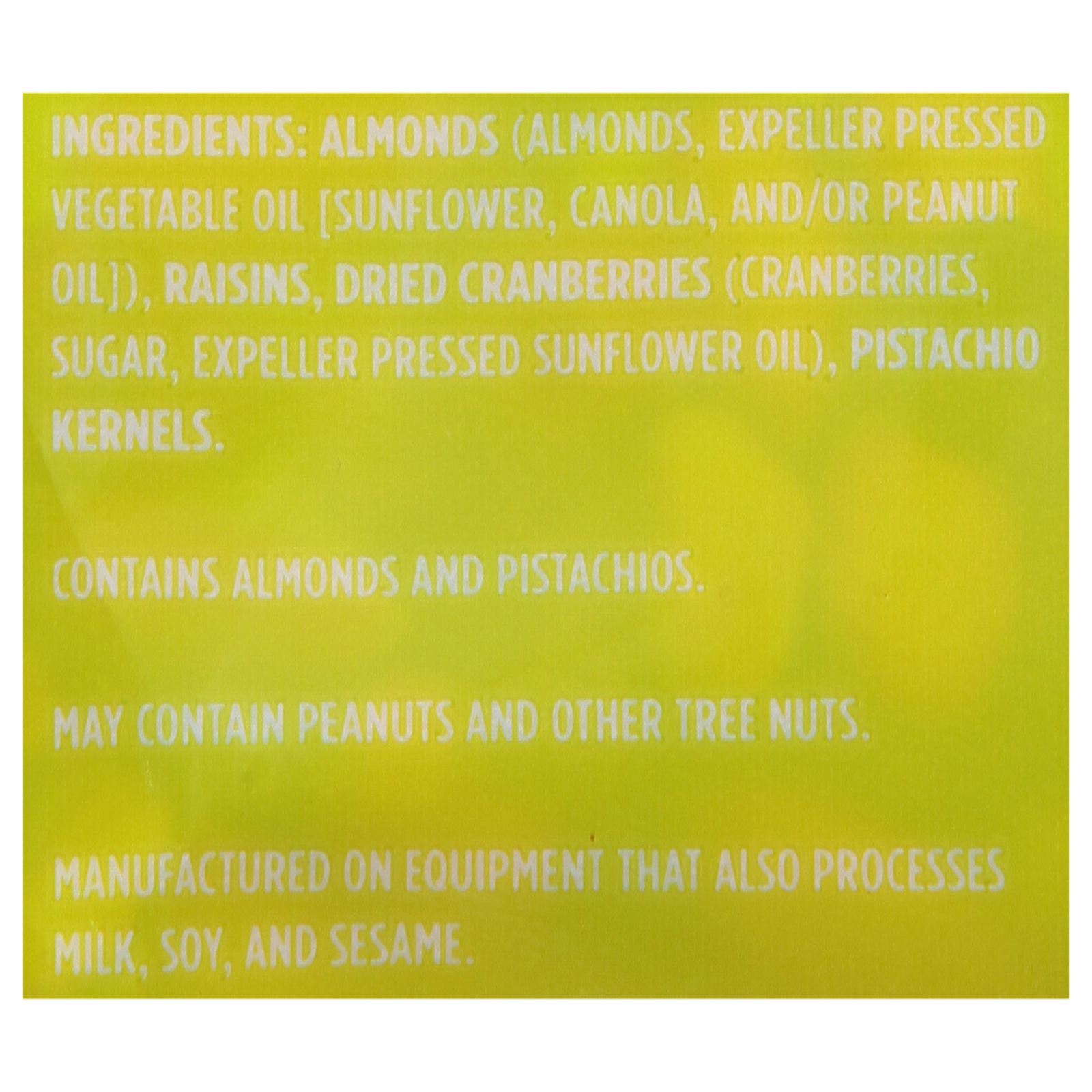 Roasted almonds, pistachios, raisins, dried cranberries.