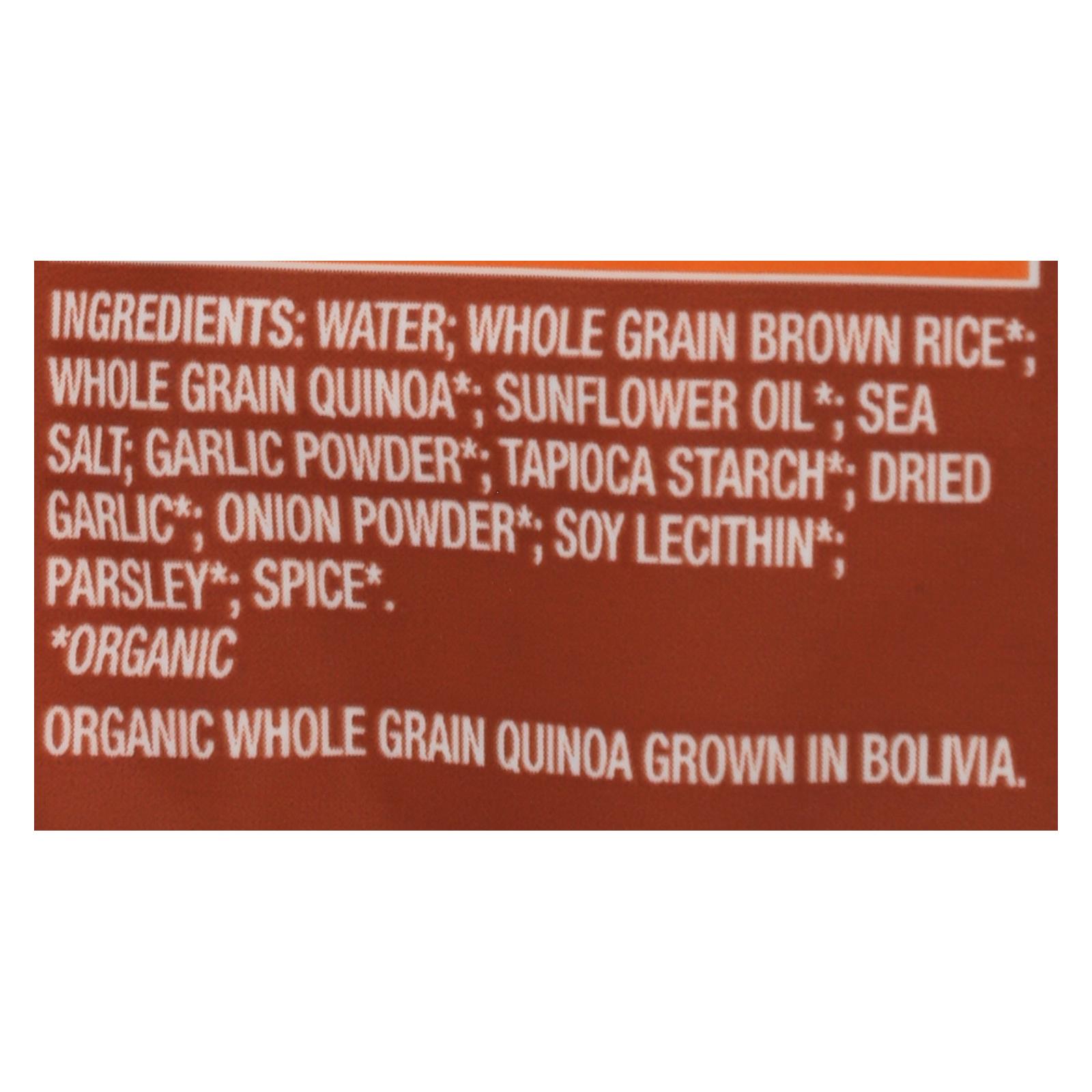 Water, whole grain brown rice*, whole grain quinoa*, sunflower oil*, sea salt, garlic powder*, tapioca starch*, dried garlic*, onion powder*, soy lecithin*, parsley*, spice (*organic ingredients)