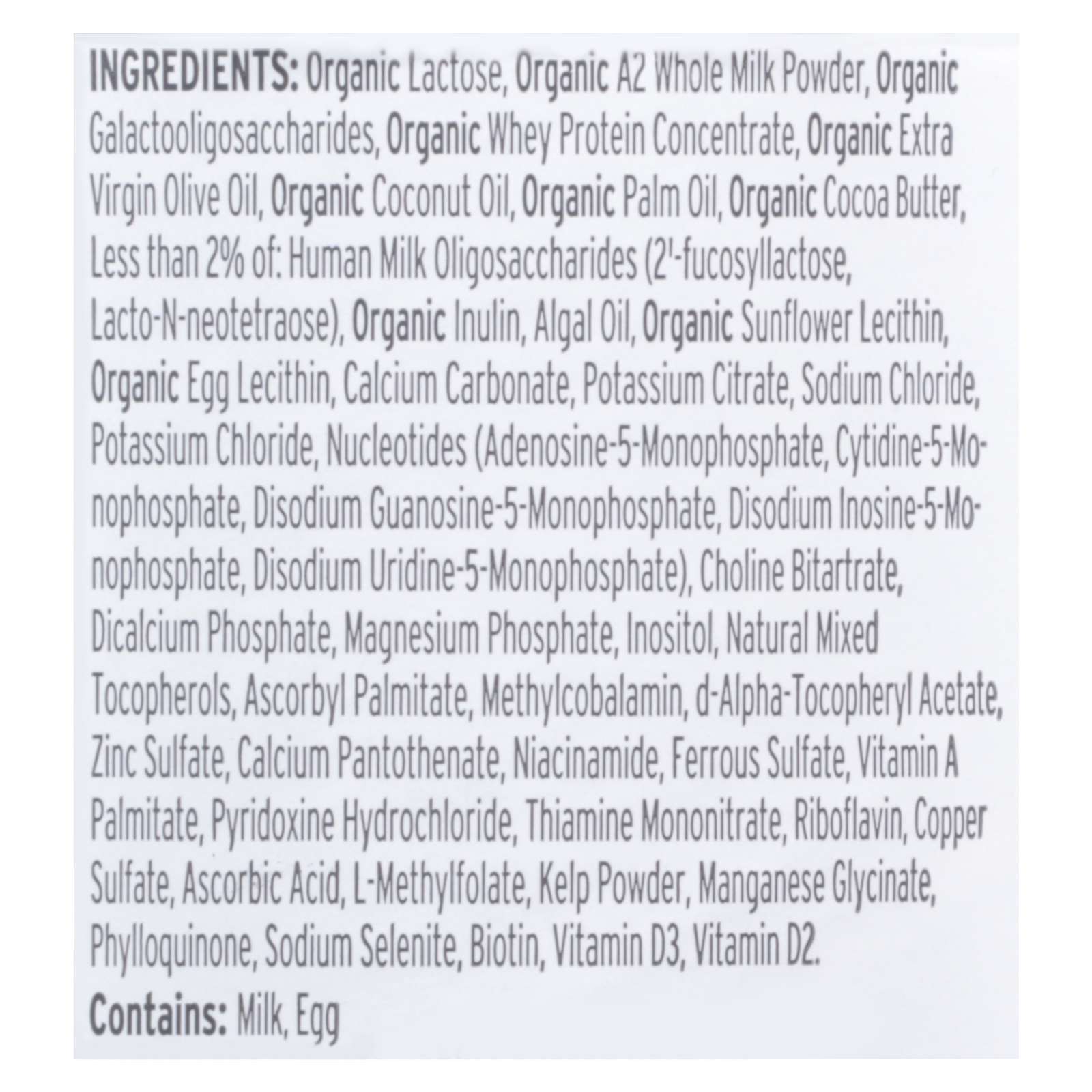Organic lactose; organic a2 whole milk powder; organic galactooligosaccharides; organic whey protein concentrate; organic extra virgin olive oil; organic coconut oil; organic palm oil; organic cocoa butter; less than 2% of: human milk oligosaccharides (2′-fucosyllactose, lacto-n-neotetraose), organic inulin, algal oil, organic sunflower lecithin, organic egg lecithin, calcium carbonate, potassium citrate, sodium chloride, potassium chloride, nucleotides (adenosine-5-monophosphate, cytidine-5-monophospha).
