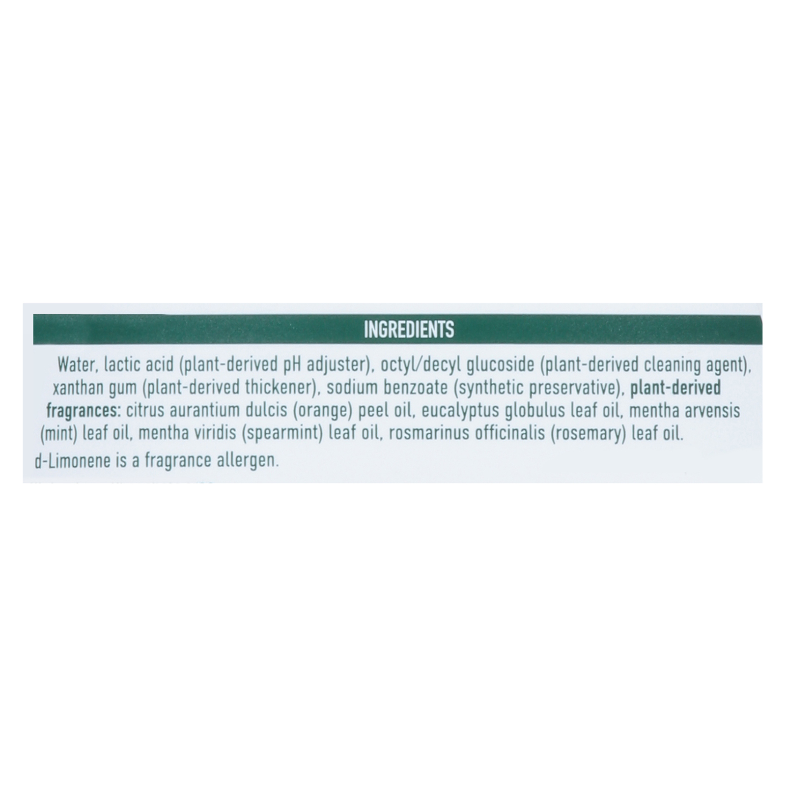 Mint fragrance and other cleaning agents. (Full ingredient list not provided.)