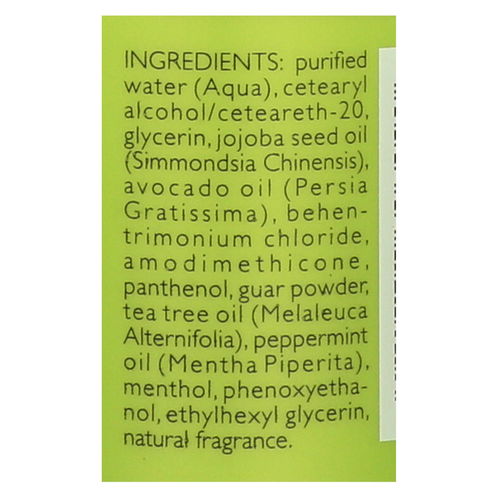 Purified water, aqua, cetearyl alcohol/ceteareth-20, glycerin, jojoba seed oil (Simmondsia chinensis), avocado oil (Persia gratissima), behentrimonium chloride, amodimethicone, panthenol, guar powder, tea tree oil (Melaleuca alternifolia), peppermint oil (Mentha piperita), menthol, phenoxyethanol, ethylhexyl glycerin, natural fragrance.