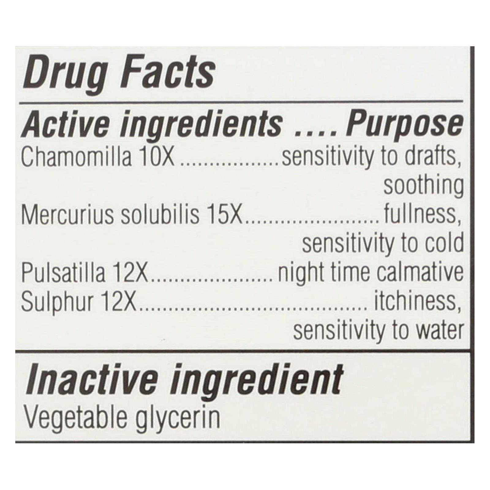Active: Chamomilla 10X (sensitivity to drafts), Mercurius 15X (soothing), Pulsatilla 12X (nighttime calmative), Sulphur 12X (sensitivity to water). Inactive: Vegetable glycerin.