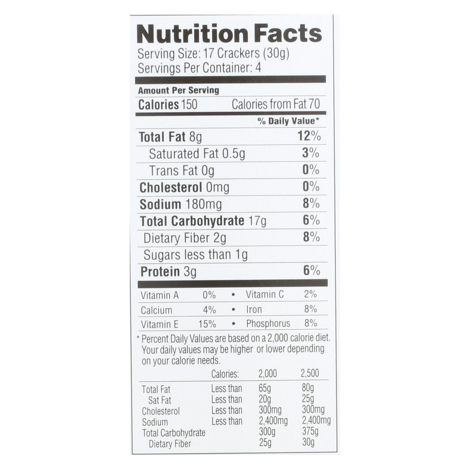 - Serving size: About 17 crackers (4 servings per 4.25 oz box)