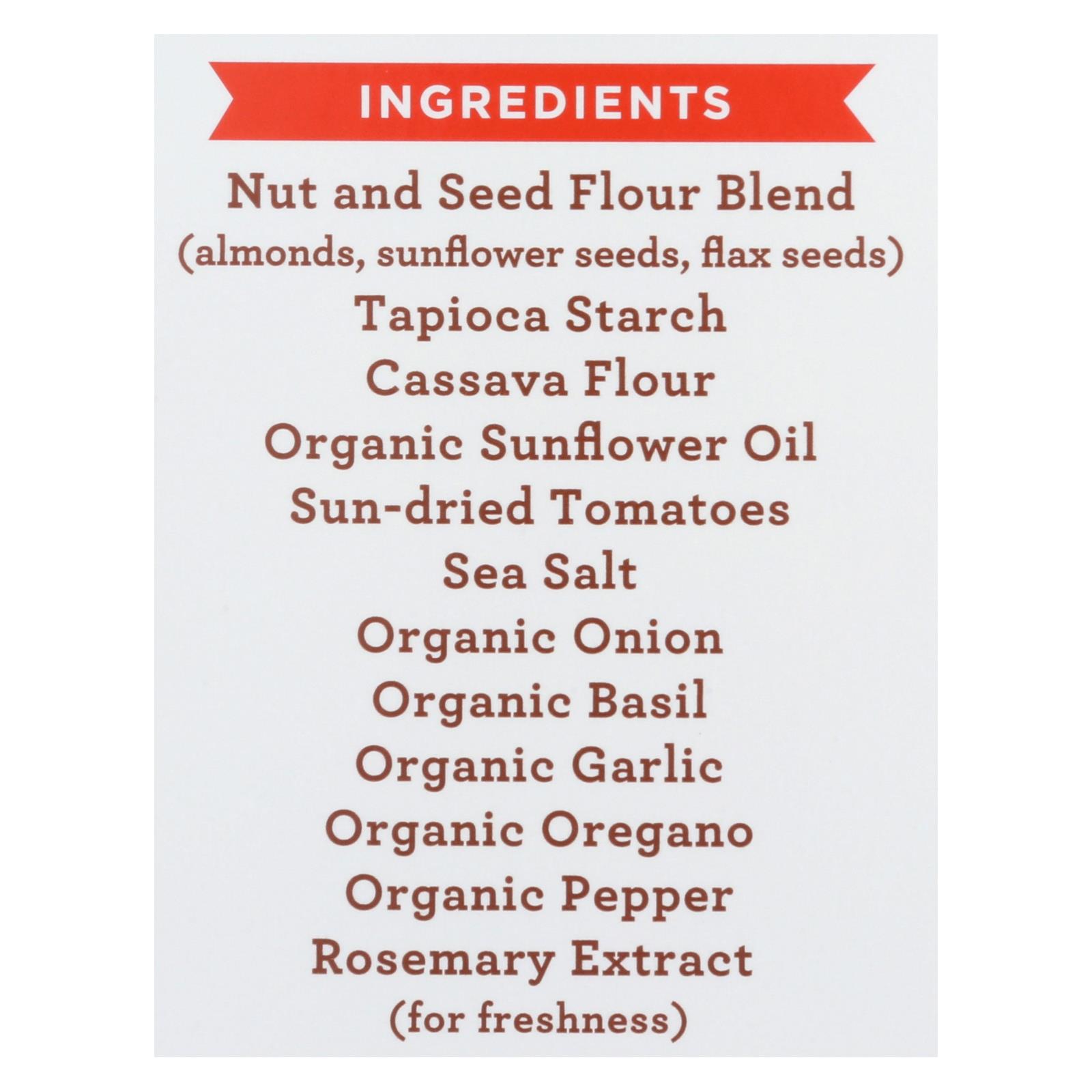 Nut & seed flour blend (almonds, sunflower seeds, flax seeds), tapioca starch, cassava flour, organic sunflower oil, sun-dried tomatoes, sea salt, organic onion, organic basil, organic garlic, organic oregano, organic pepper, rosemary extract (for freshness).