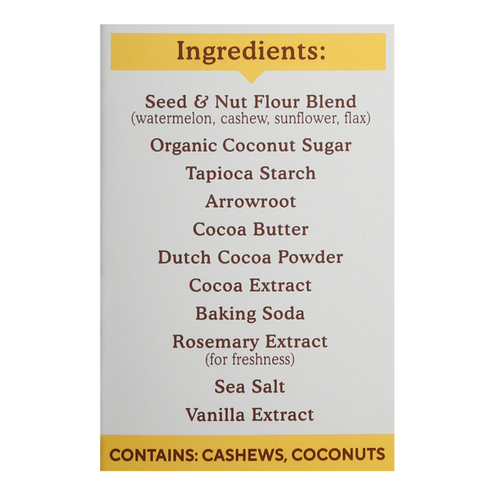 Seed & nut flour blend (watermelon, cashew, sunflower, flax), coconut sugar, tapioca starch, arrowroot, cocoa butter, Dutch cocoa powder, cocoa extract, baking soda, rosemary extract (for freshness), sea salt, vanilla extract.