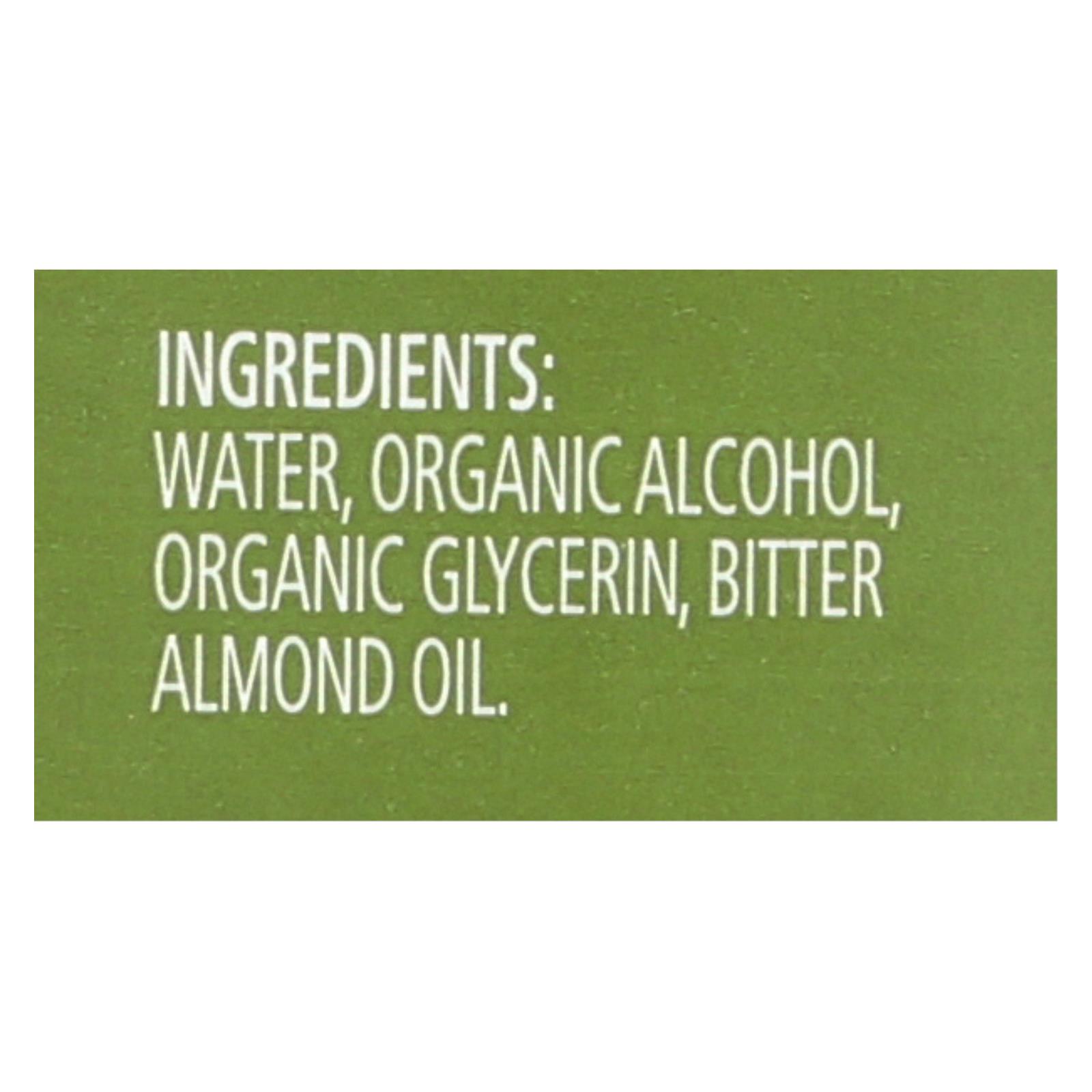 Ingredients: Purified water, organic alcohol, glycerin, natural bitter almond oil.