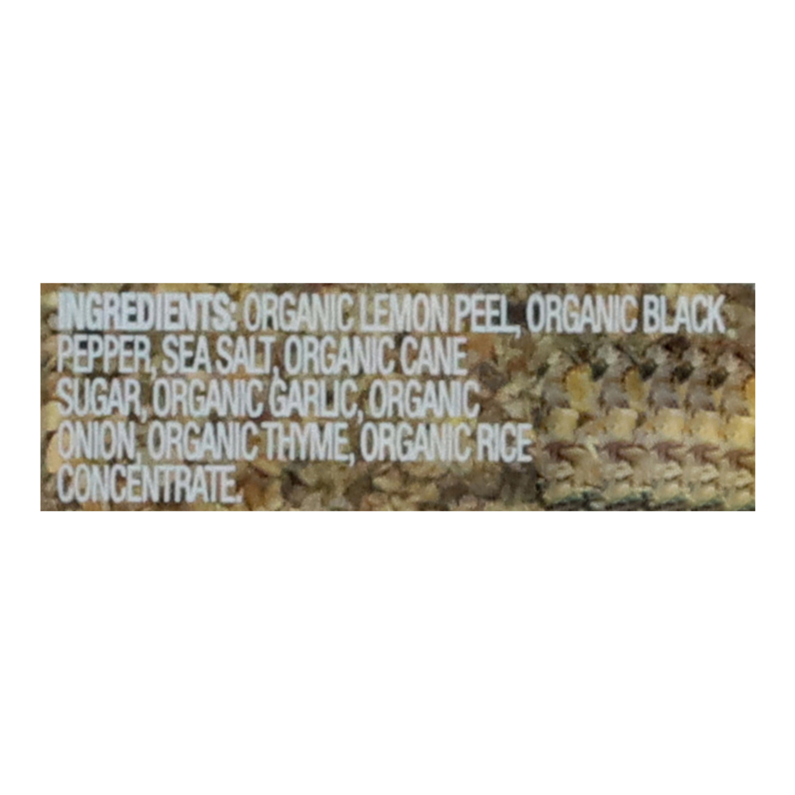 Organic lemon peel, organic black pepper, sea salt, organic cane sugar, organic garlic, organic onion, organic thyme, organic rice concentrate.