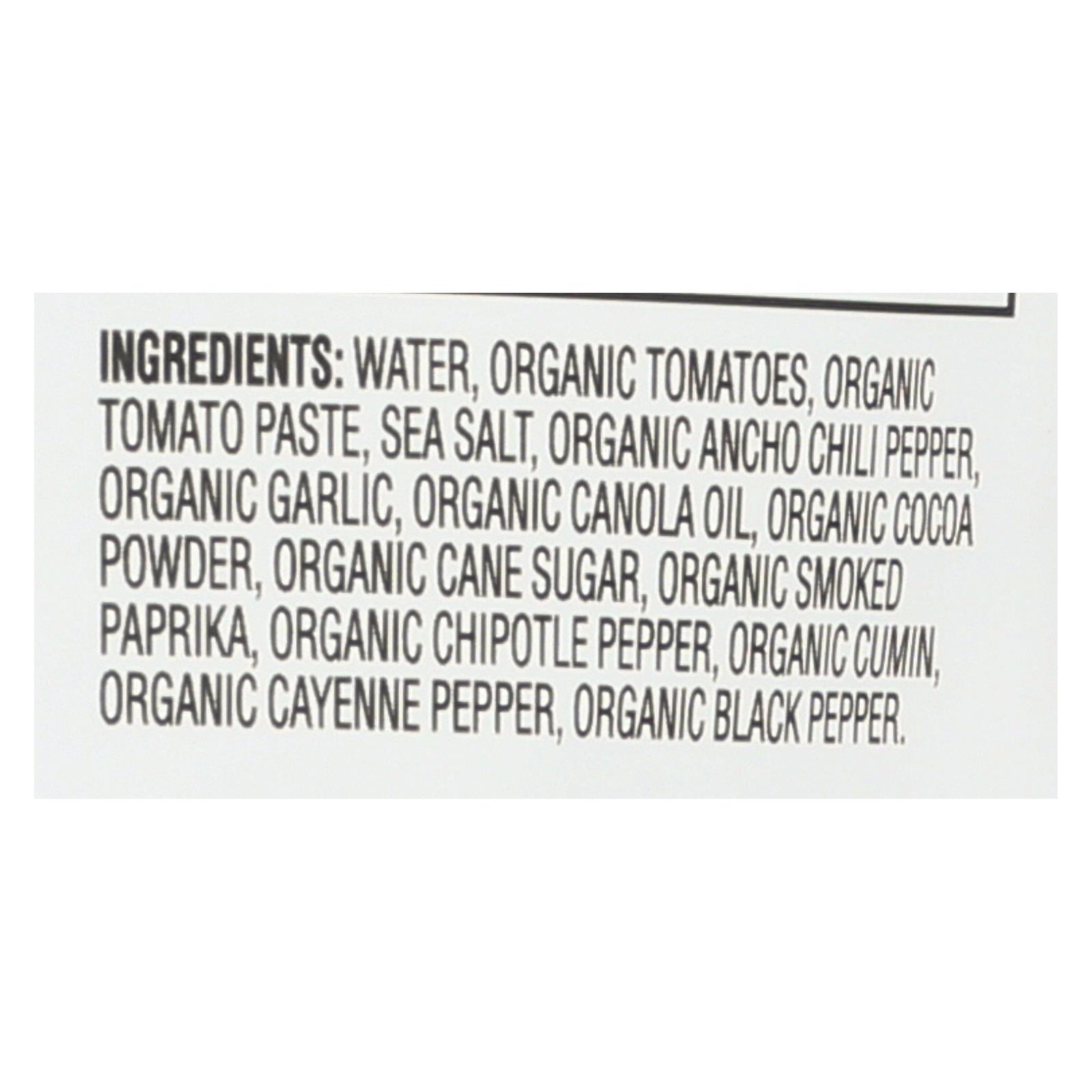 ingredients : water;organic tomatoes;organic tomato paste;sea salt;organic ancho chili pepper;organic garlic;organic canola oil;organic cocoa powder;organic cane sugar;organic smoked paprika;organic chipotle pepper;organic cumin;organic cayenne pepper;organic black pepper