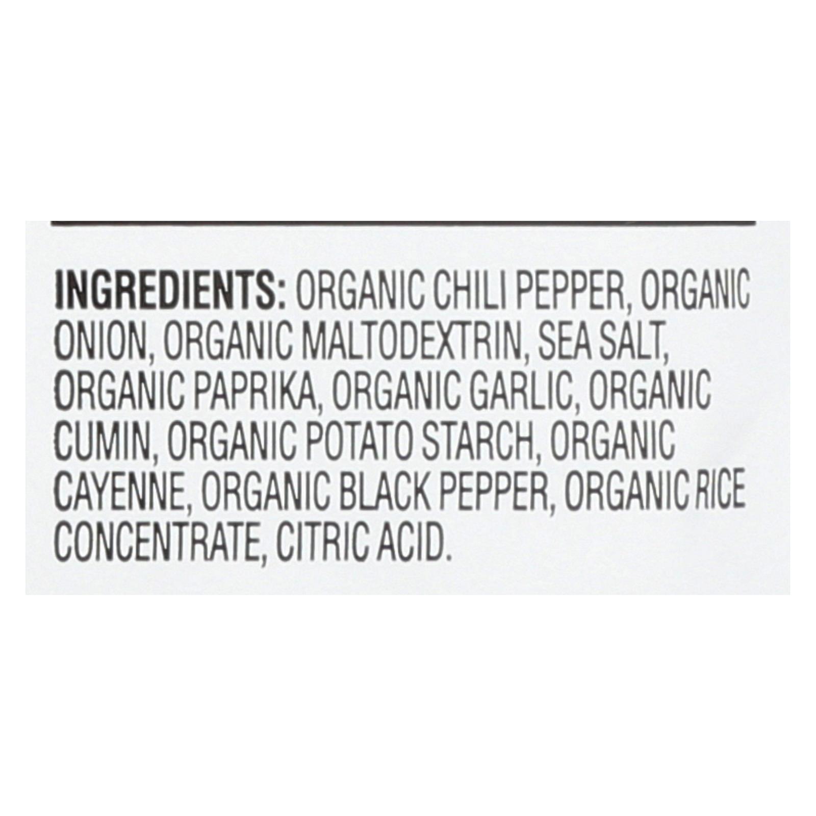 ingredients : organic chili pepper;organic onion;organic maltodextrin;sea salt;organic paprika;organic garlic;organic cumin;organic potato starch;organic cayenne;organic black pepper;organic rice concentrate;citric acid
