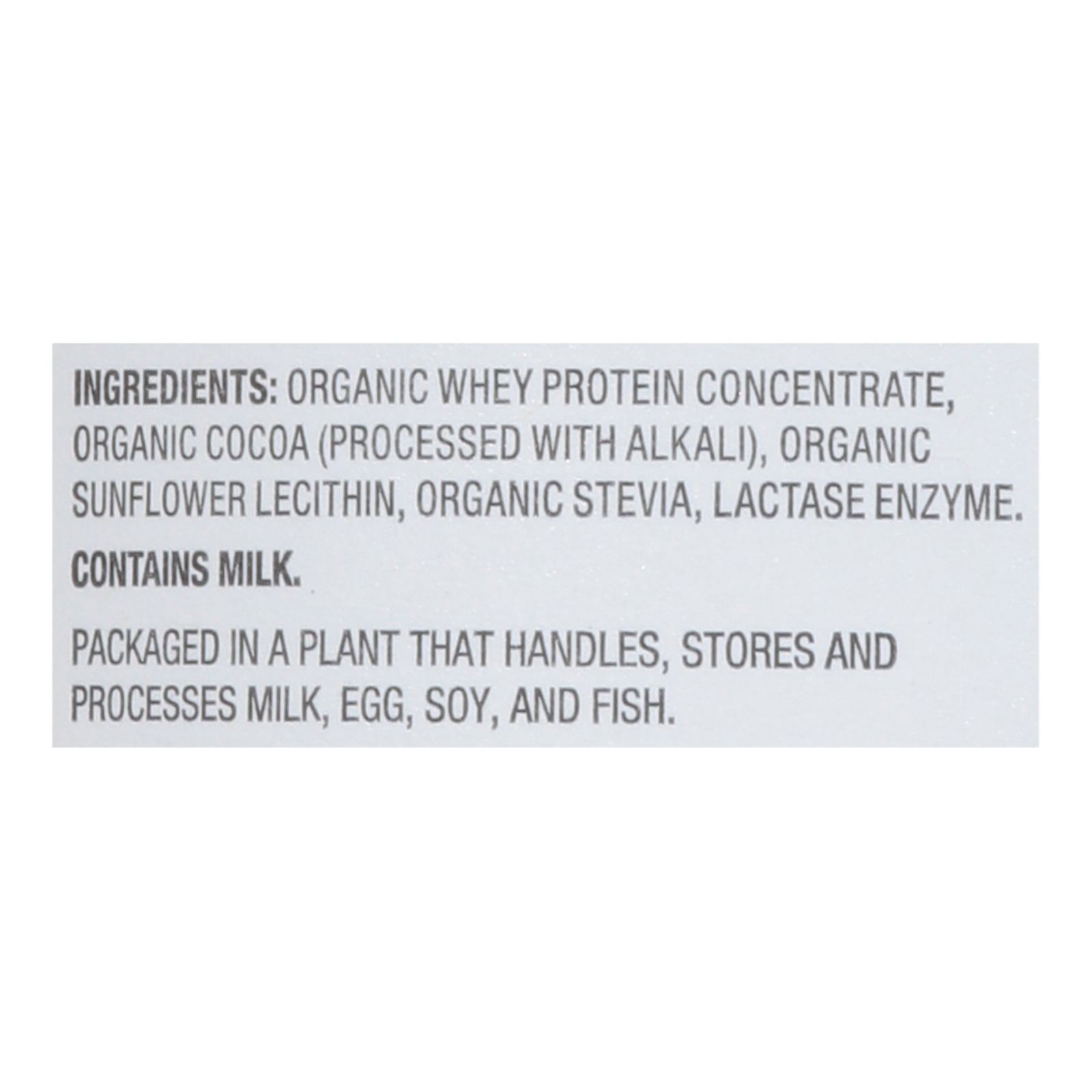 Organic lactose-free whey protein, organic cocoa, organic flavor, organic stevia, organic sunflower lecithin.