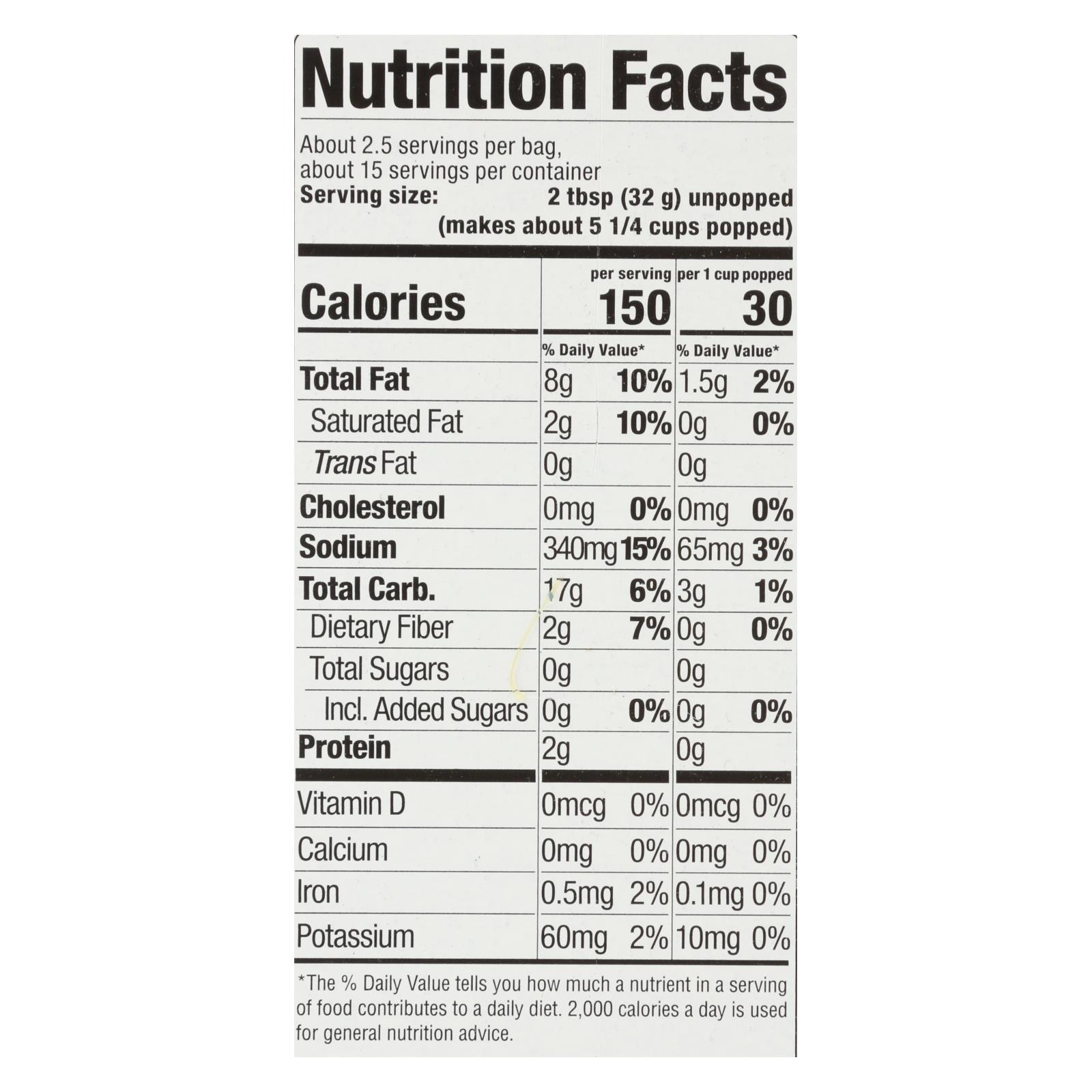 ingredients : popcorn;sunflower oil;palm oil;sea salt;natural non-dairy butter flavor and lactic acid;for flavor